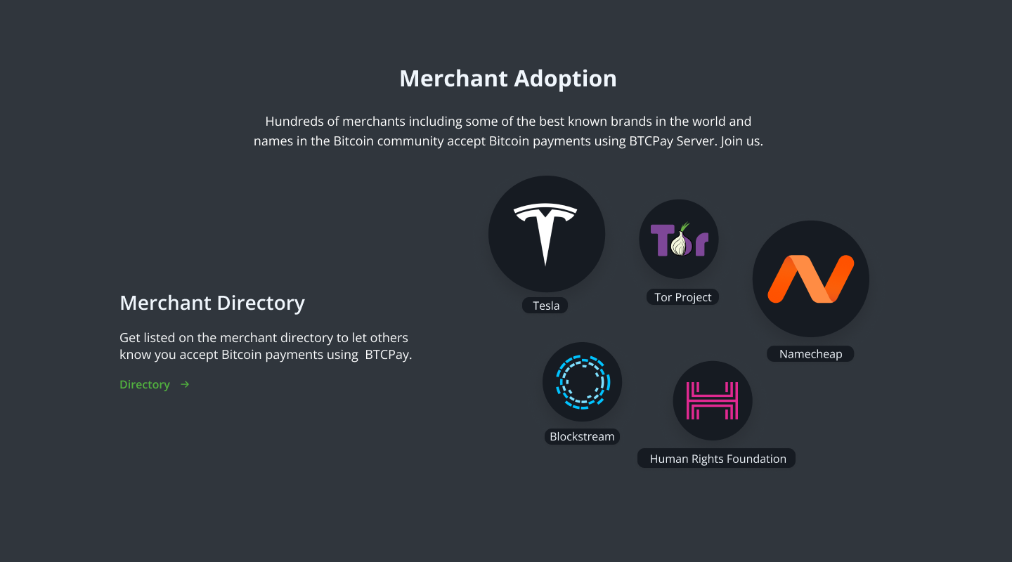 BTCPay Directory is a place for merchants from all over the world to advertise themselves as accepting Bitcoin payment and using BTCPay to do so.