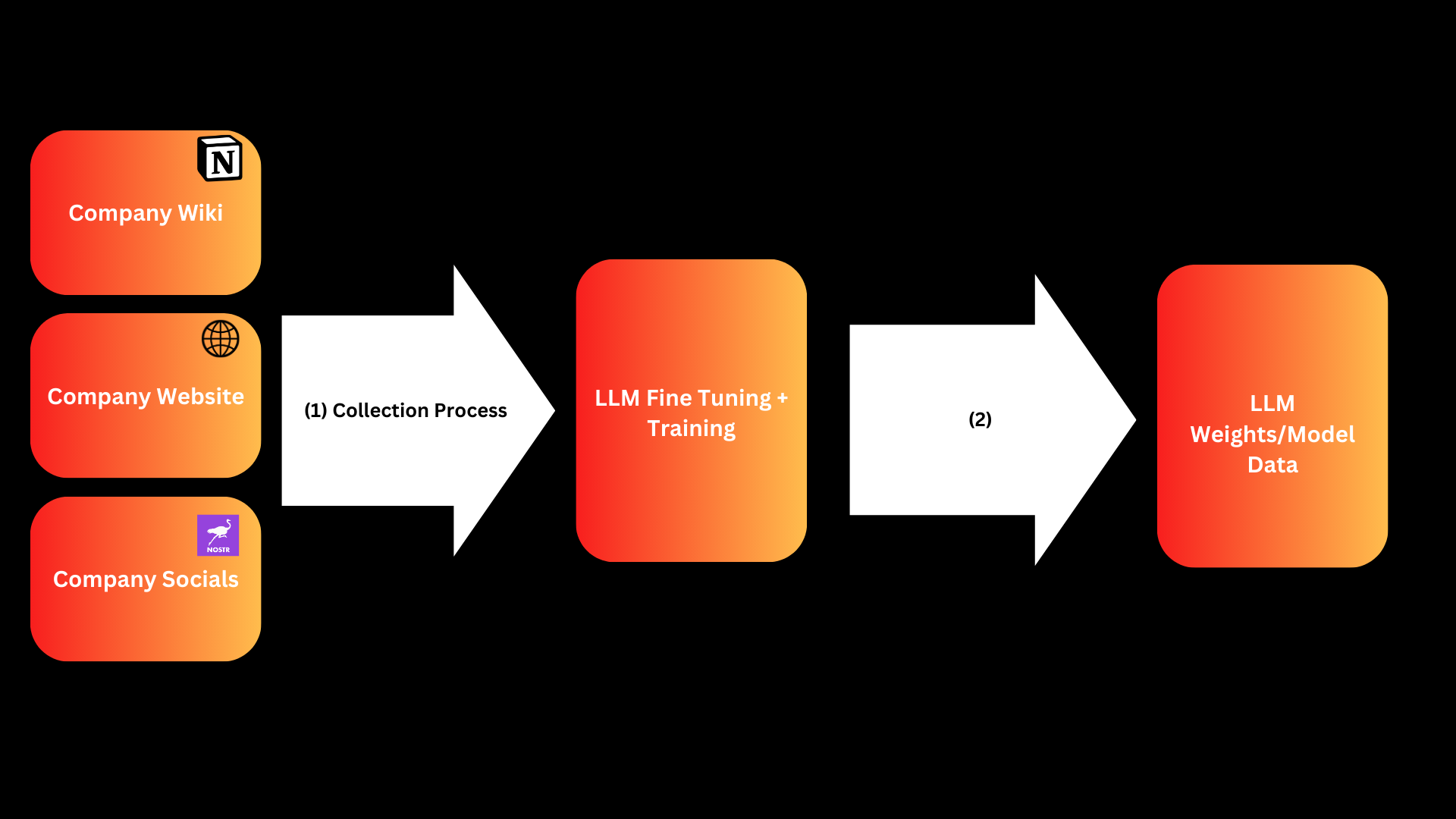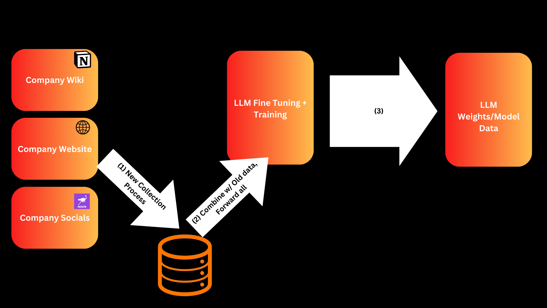 Suppose we want to train an LLM to take on the Knowledge Base of disparate sources of information such as our company wiki, website and social media profiles. Suppose we also want that knowledge base to evolve over time and periodically retrain the model so that it is up to date with the latest information. We may wind up with a workflow something like the following: