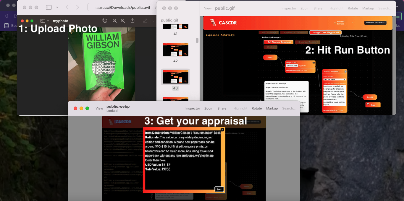 With these services enabled, we created several examples that can accomplish tasks ranging from transcribing a YouTube link to helping you appraise the value of your belongings in Satoshis with just a picture.
