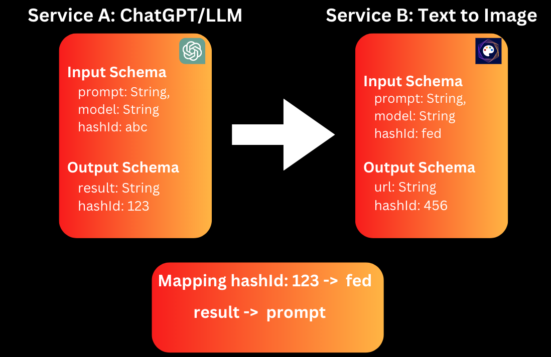 The compiler + client would pull all relevant mappings, select one and apply it. In this case, it would pull the mapping of LLM "result" to Text to Image's "prompt"