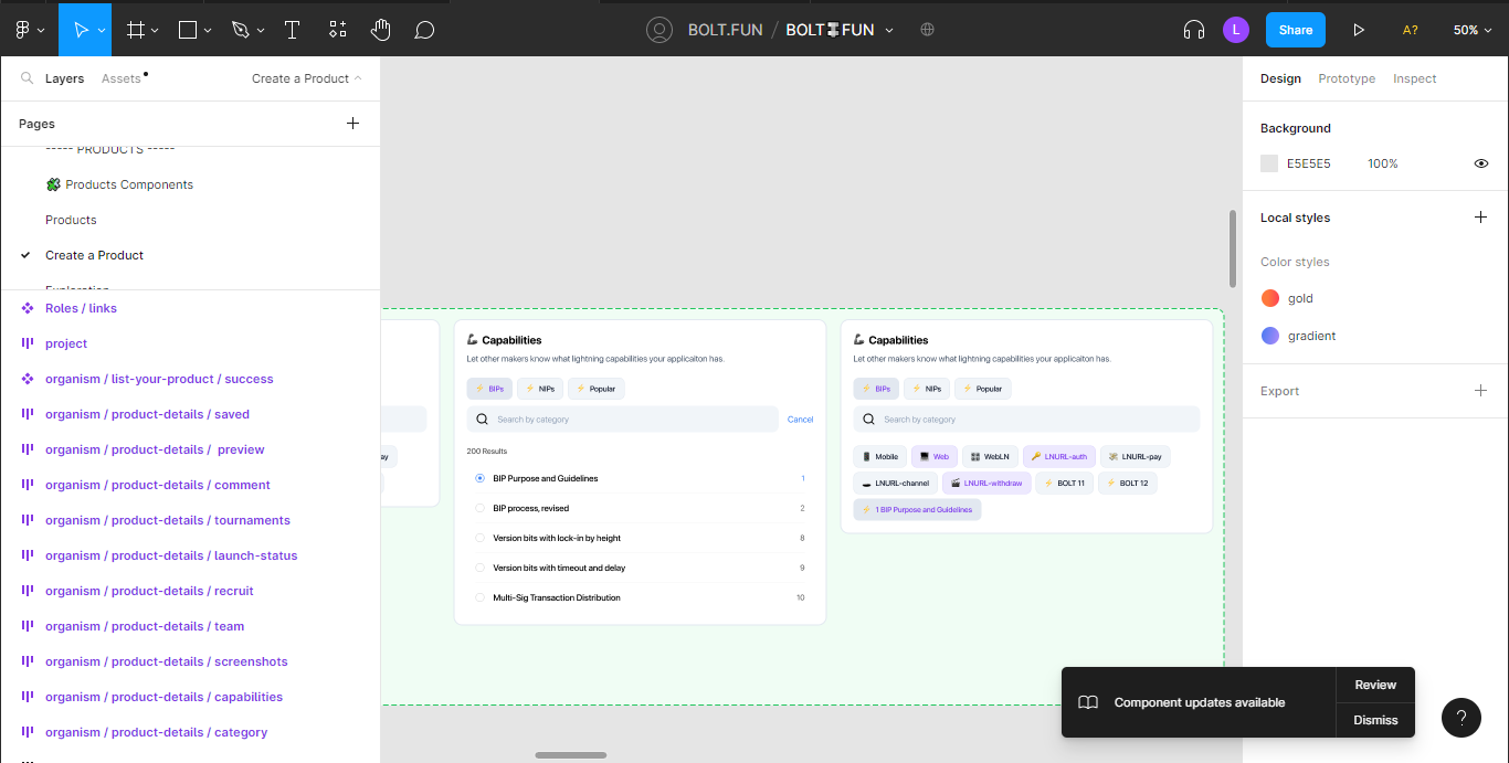 Today, I did some design explorations for the BOLT.FUN project's capabilities section. Specifically, I was tasked with adding a large number of specifications called Bitcoin Improvement Proposals (BIPs) and Nostr Improvement Proposals (NIPs). My primary focus was on making it easy for people to add these capabilities to their projects, with easy navigation through them, since there are so many of them, and filter through them.
