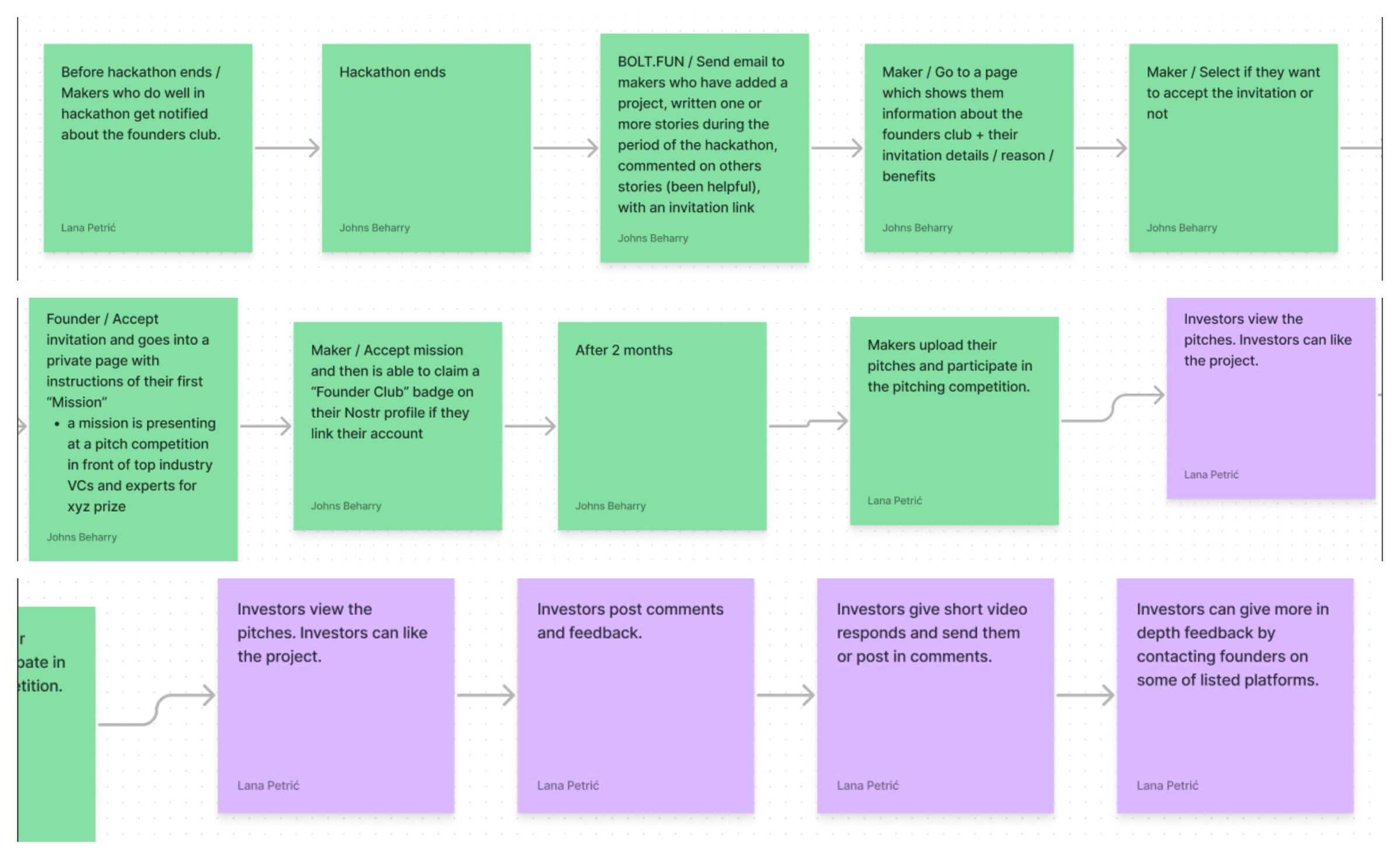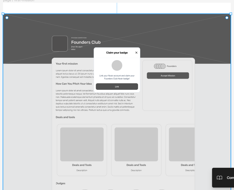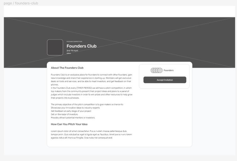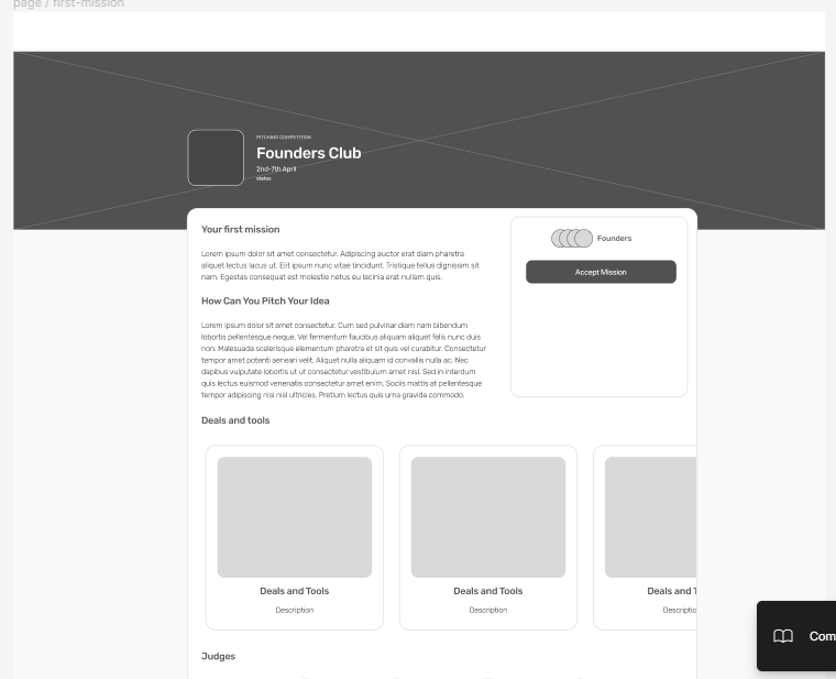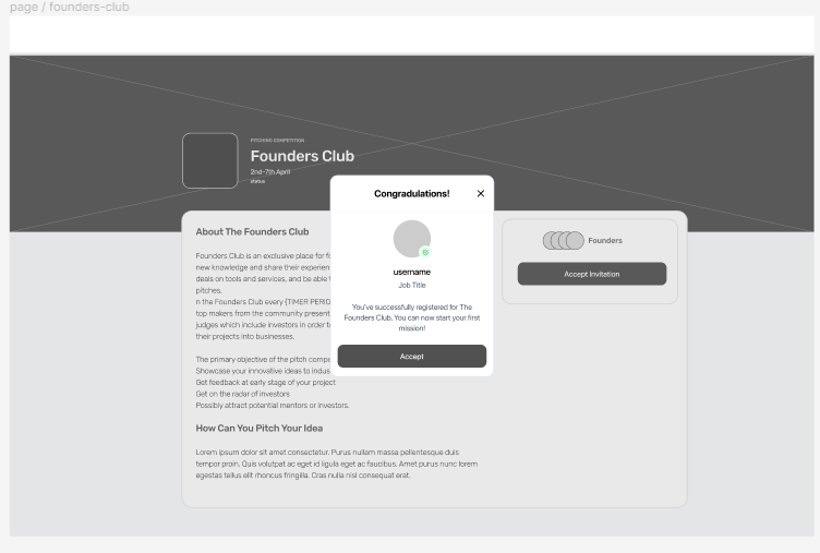 Today I focused on creating rough wireframes for the Founders Club project. In the previous day Johns and I worked together to create a user journey and mapped out the steps from accepting an invitation to the Founders Club to participating in the pitch competition. From there, I designed wireframes for key points in the journey.