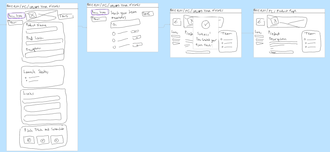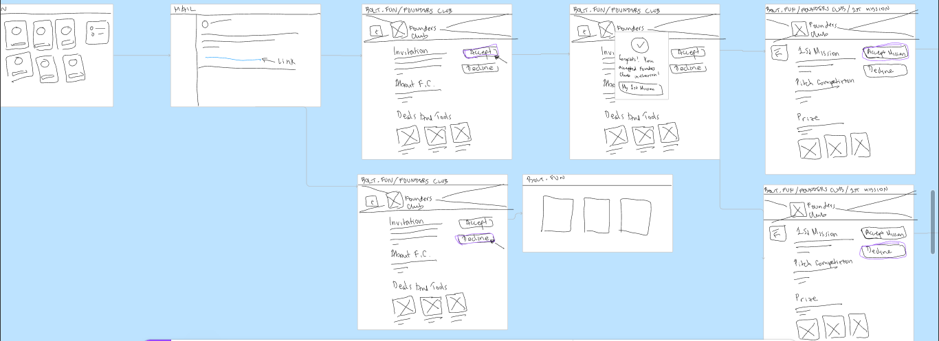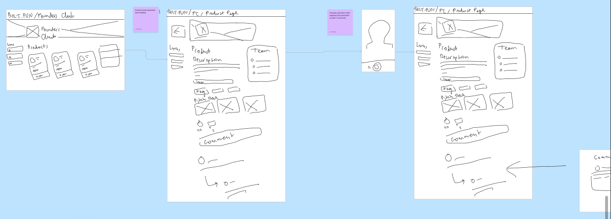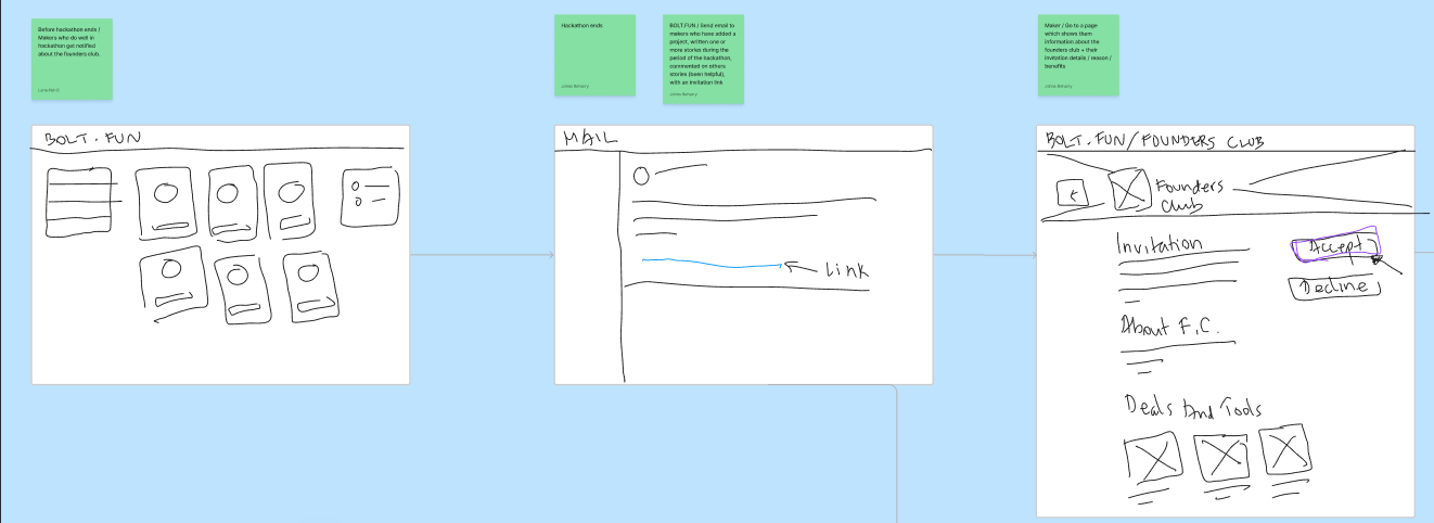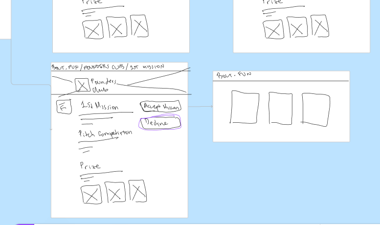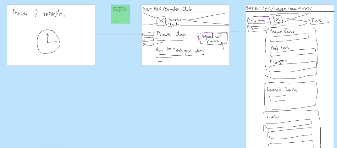 I began my day by delving into research on design sprints and storyboards. As I was feeling a bit stuck and uncertain about the final goal of designing the Founders club, I recognized the need to gain a clearer understanding of these concepts. I realized that to move forward with designing the wireframes for the founders club, I needed to create a more comprehensive user journey storyboard. This allowed me to visualize the necessary elements on every page I created and determine what had been missing in my previous work. To begin this process, I started by sketching the first step of the founders' journey: how they would discover the founders club. From there, I created a sketch of the final outcome, which was the pitch competition. With these two endpoints in mind, I was able to frame my storyboard and fill in the steps in between. I focused on the founders' journey and visualized the user journey solutions that Johns and I had previously created. To better think through the relationships between pages, I sketched everything in the form of a UI flow. I also made sure not to add any unnecessary elements or new ideas.