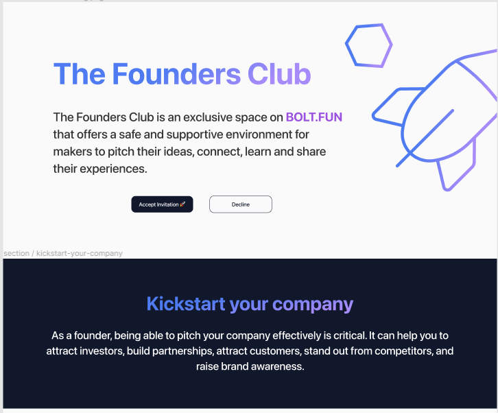Today, I continued designing the landing page for the Founders club. I started by exploring various layouts and design ideas to find the best possible design that would be unique to the Founders Club while maintaining the BOLT.FUN aesthetic and design. In addition to the landing page, I also designed a template for the mail invitation. This was an opportunity for me to apply the design principles from the landing page to another medium and encourage makers to explore the invitation and participate in the pitching competition.