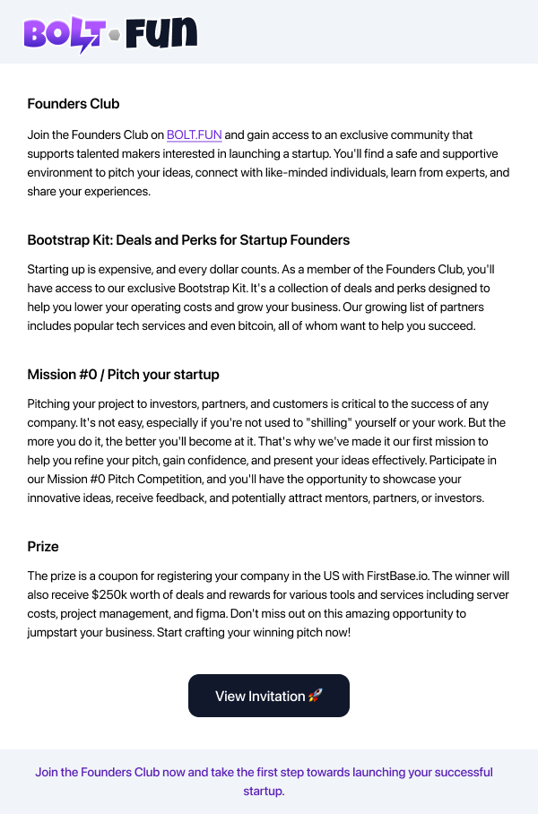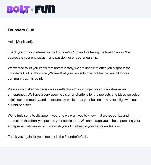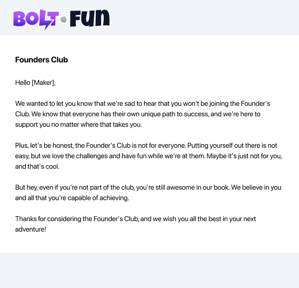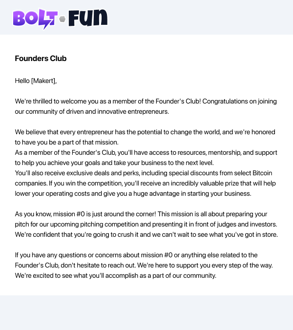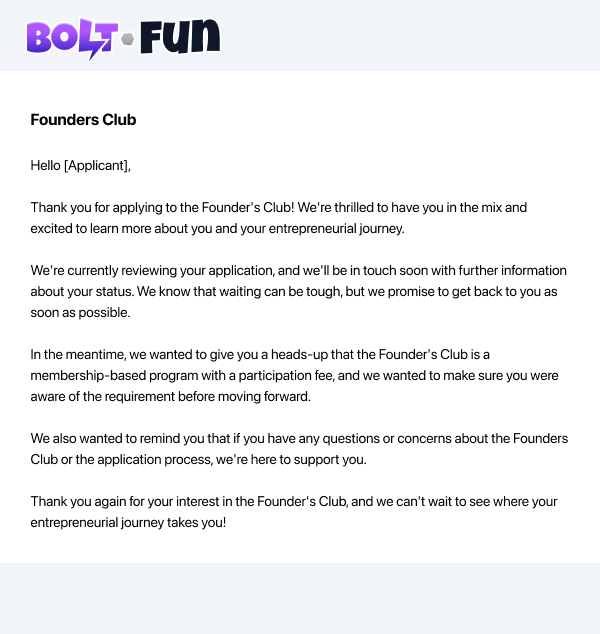 Challenges: The main challenge was creating friendly and sincere responses for the different onboarding stages to the Founders Club. I had to make sure that the tone of the emails was inviting and welcoming, while also providing clear instructions and information about the process.