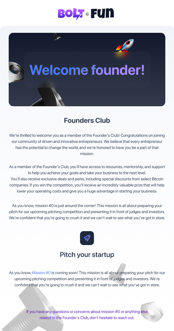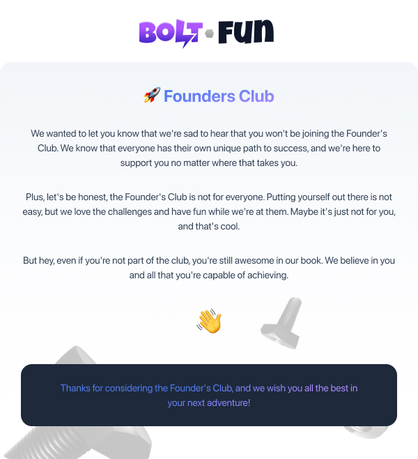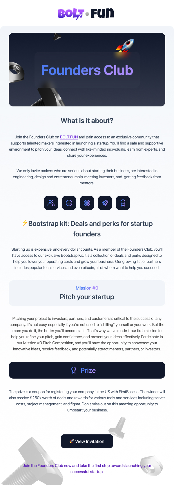 Challenges: The main challenge was to redesign the email templates to fit the Founders Club aesthetics and convey the playfulness and feel of BOLT.FUN, while also providing necessary information. Additionally, ensuring users filled out their maker profile to a certain extent before applying was also a challenge.