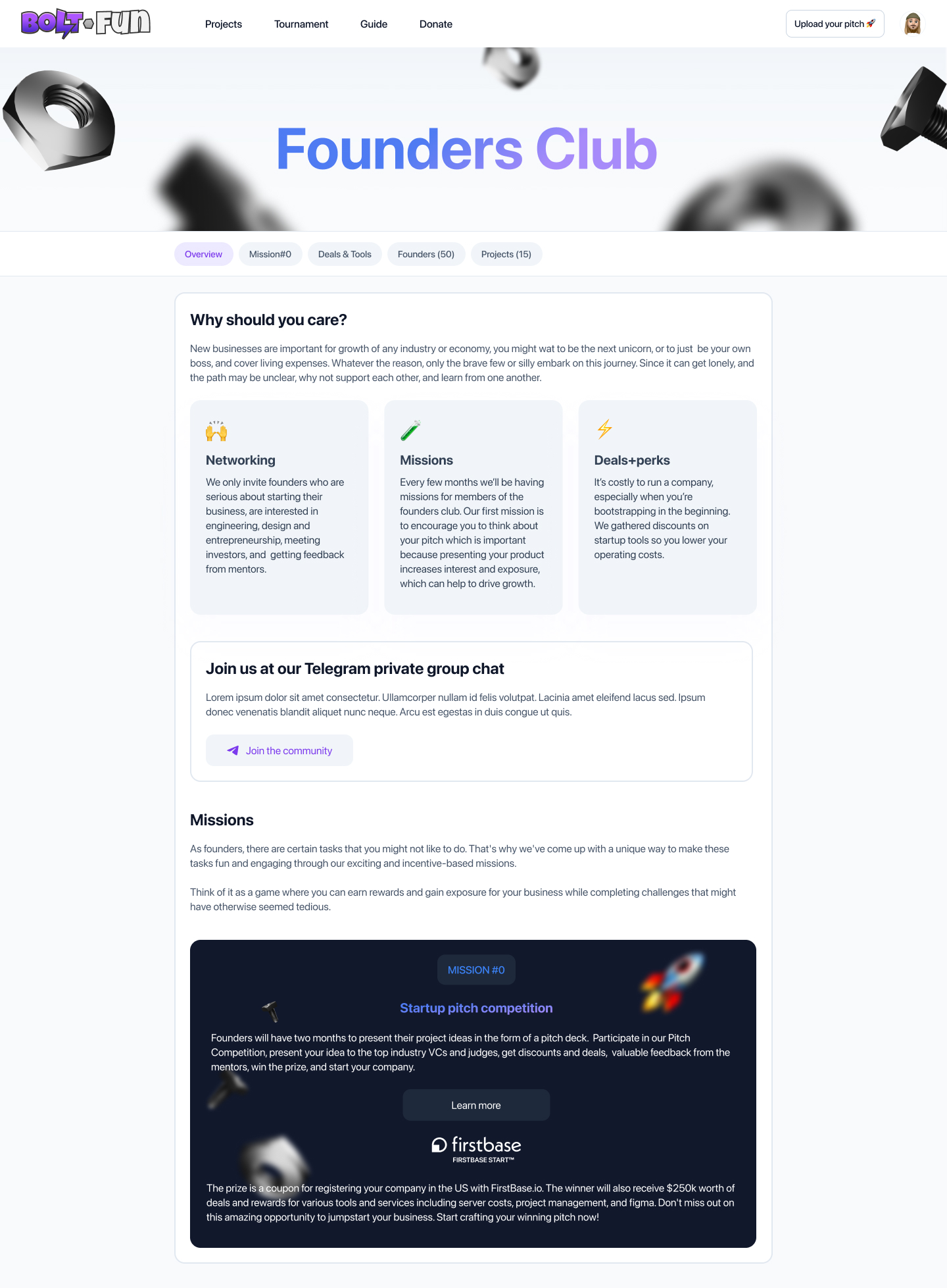 I made some changes to the Founders Club Overview page by adding new sections. The idea was to create the Overview as a point from which founders can jump off to different areas, such as a private telegram group chat or details about missions. I also added a new tab, Mission#0, and designed some basic layouts for it.