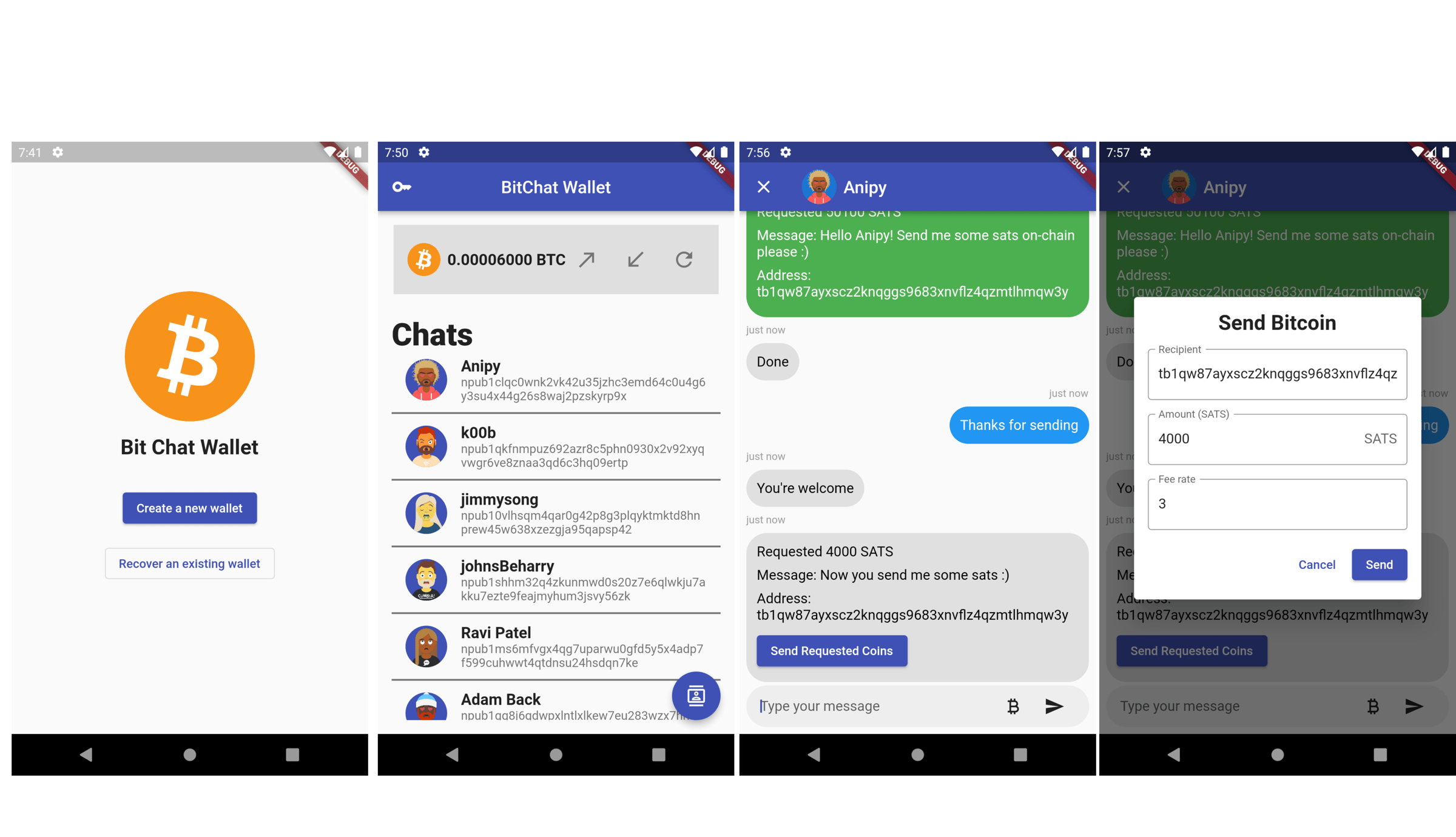 Bitchat Wallet provides a seamless experience for users with features like requesting bitcoins from other users, sending and receiving bitcoins securely, and end-to-end encrypted (E2EE) communication. The technology stack of my project includes Flutter framework for the frontend, Bitcoin Development Kit, and Nostr Tools Dart package. Specifically, I have been implementing NIP-06, NIP-19, and NIP-04 in Bitchat Wallet.