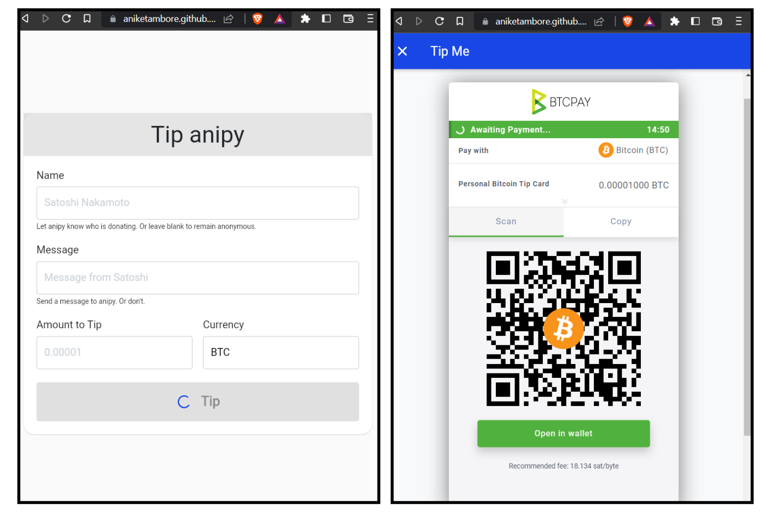 Here's how it works: when someone clicks the Tip Bitcoin button, they'll be taken to a tipping form where they can enter the amount, their name, and a message. The form then generates an invoice using the BTCPay API, which the user can pay using their Bitcoin wallet.