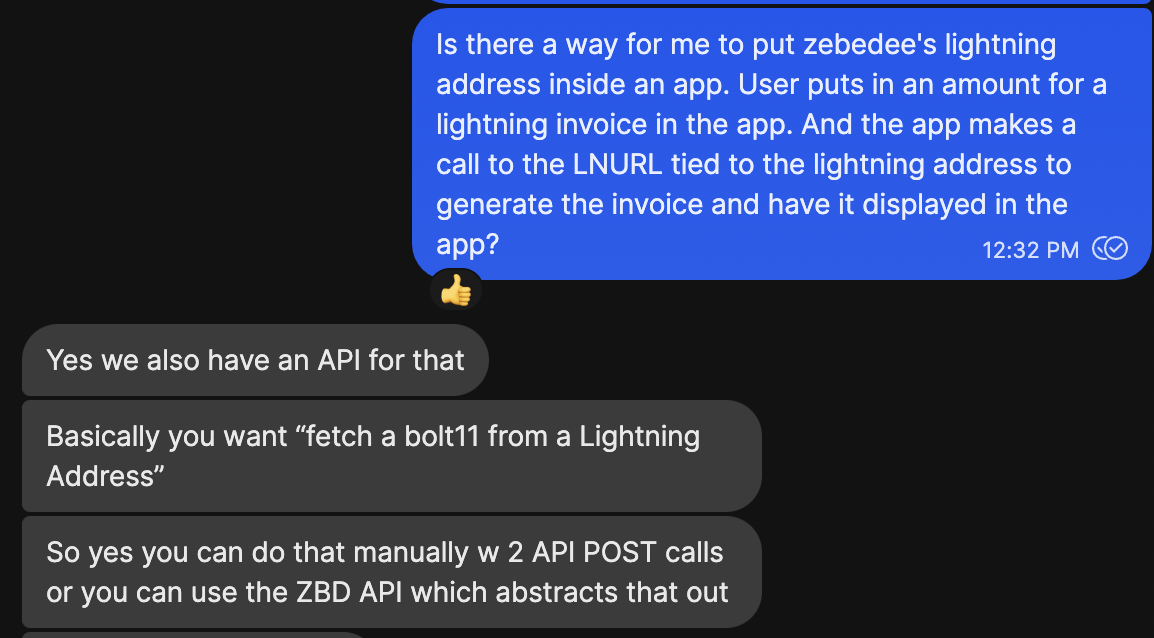 From a tech perspective, it made sense to me that I could make a call to Zebedee's api to grab the invoice. But then I realized I wasn't plugged in directly to their node or payment logic, so I had no way of knowing if the invoice had been paid.
