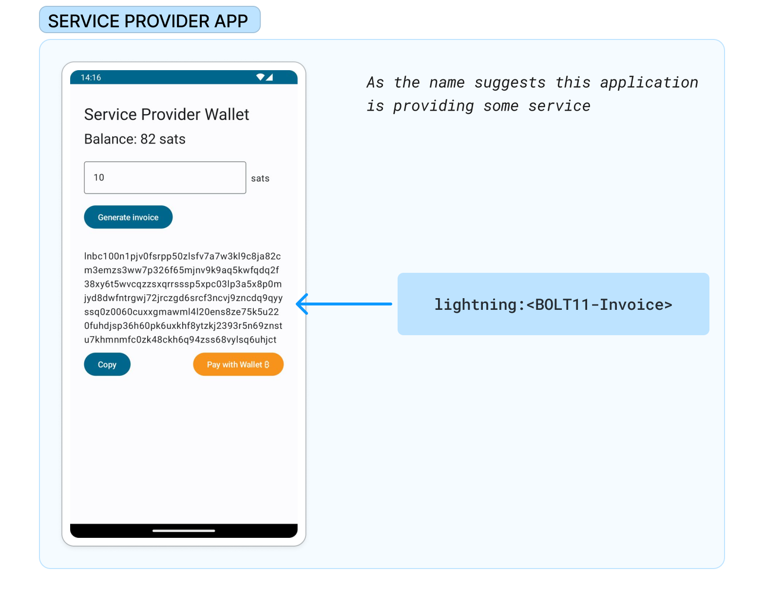 When the user clicks the payment button in the Service Provider App, the app constructs an ACTION_VIEW Intent containing the URI with the "lightning" scheme which may look like "lightning:///{lightningInvoice}". The intent is then sent to the Android system to be resolved and launched.