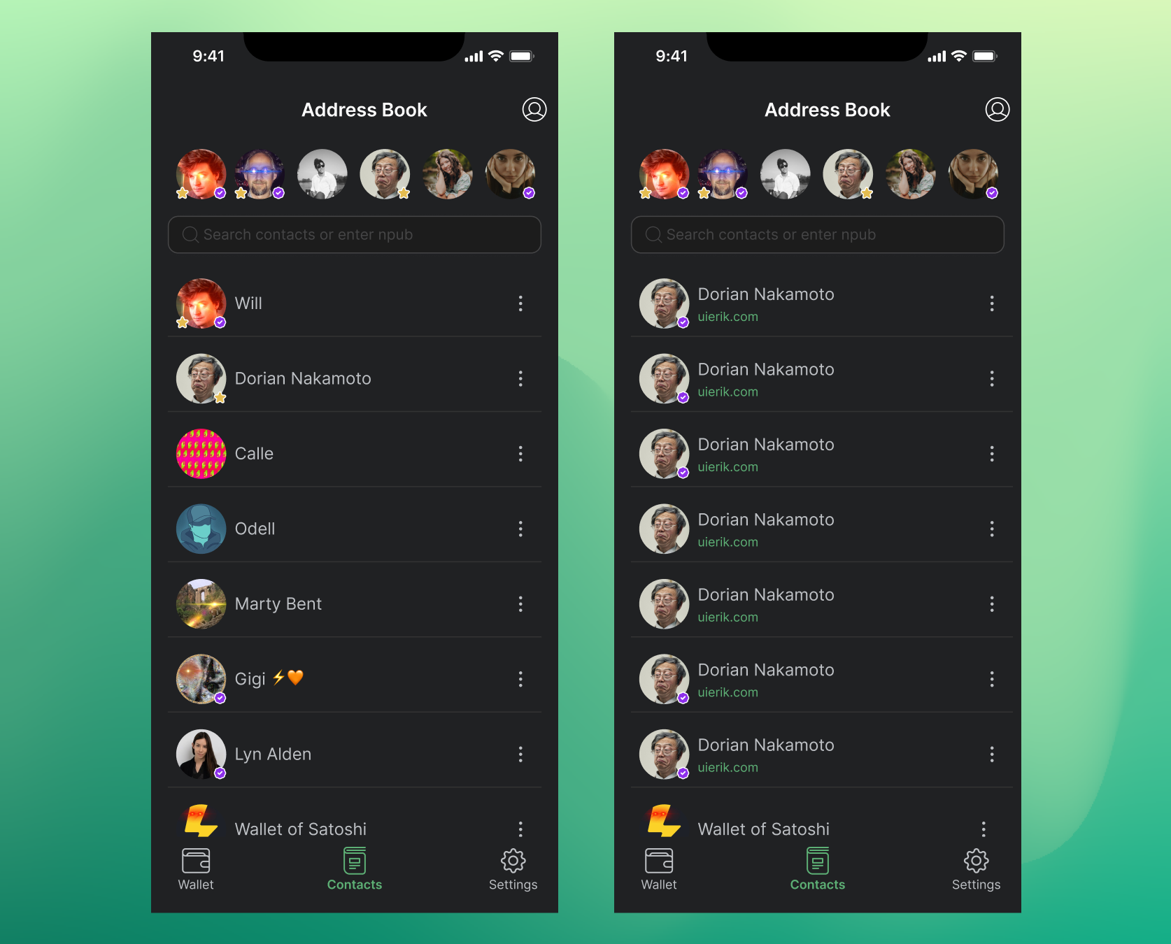 In the contact list, we are considering the display of all NIP05 verified users with a purple checkmark. Additionally, users have the option to add a contact to their 'Favorites', as indicated by the star icon. Upon doing so, these favorited contacts will be prioritized at the top of the list, alongside any recent contacts with whom payments have been exchanged.