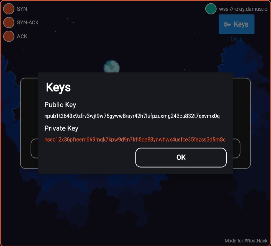 Next, click on the "Keys" button located in the top right corner. It will display a dialog box with your npub and nsec keys: