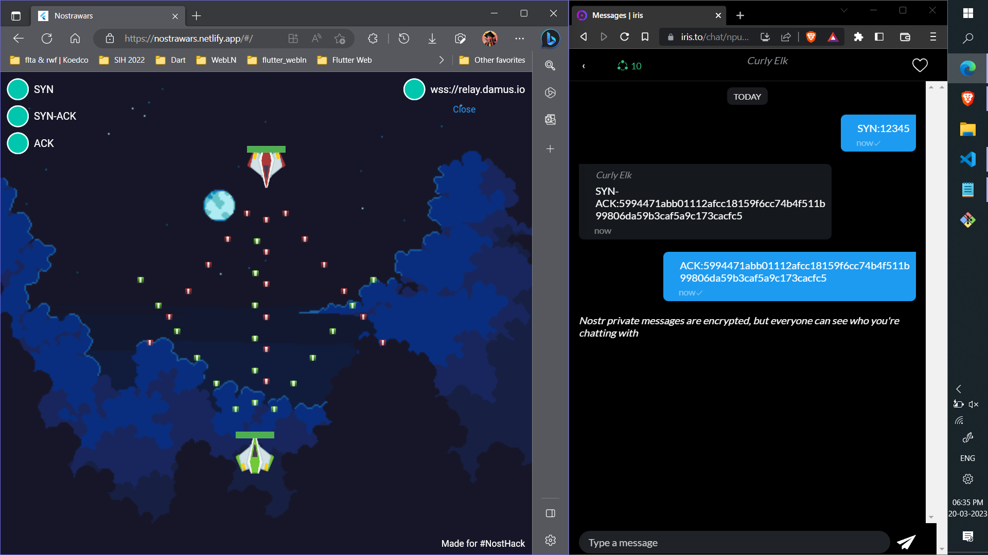 After sending that message, the "SYN" and "SYN-ACK" will turn green on the Nostrawars screen. On your client, you will receive the SYN-ACK message.