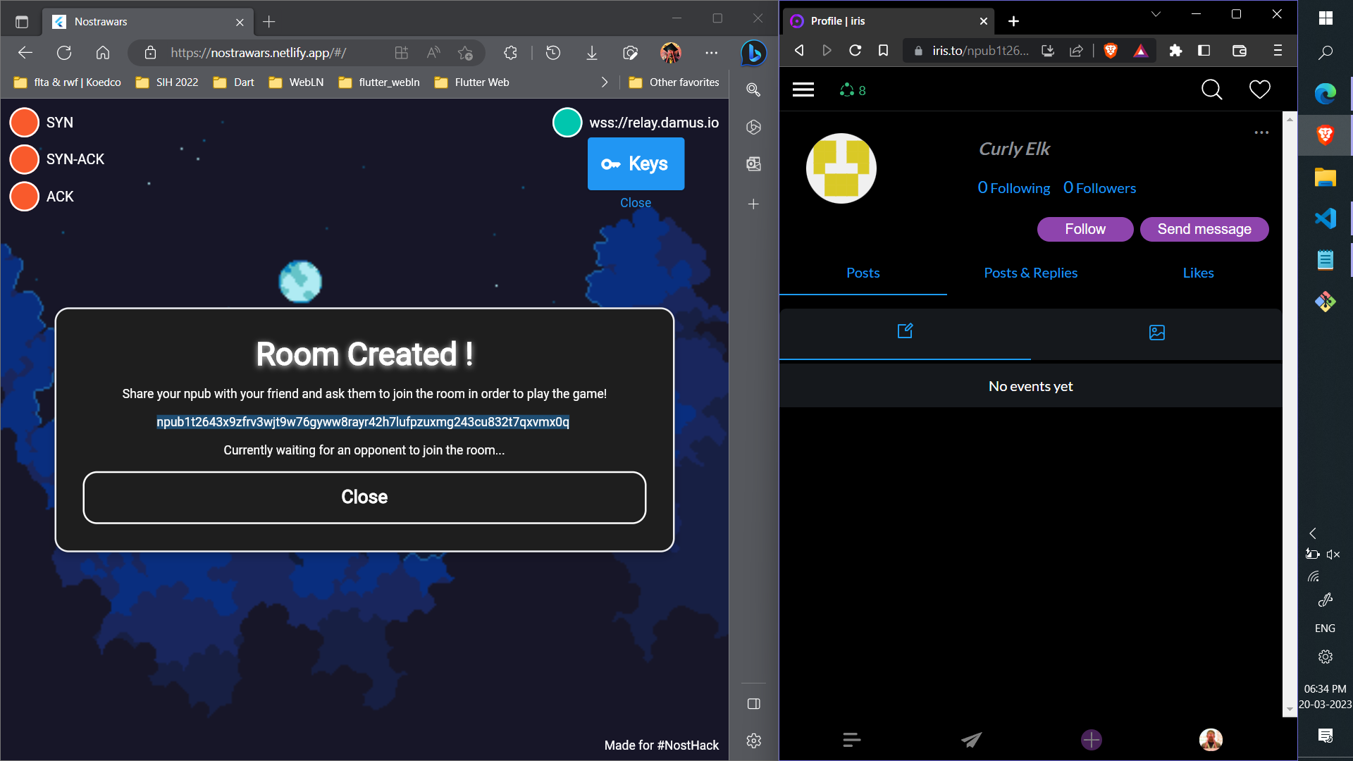 Why is a three-way handshake important in a multiplayer game like Nostrawars? A three-way handshake is a method used in network communication to establish a connection between two devices. In Nostrawars, the three-way handshake ensures that both players are connected to the same relay and that their connection is secure and reliable. This is crucial for a multiplayer game as it ensures that the players receive the same game state and that there are no inconsistencies or discrepancies between the players. Without a secure and reliable connection, the game would not be playable, and there would be no way to ensure that both players have a fair and equal chance of winning.