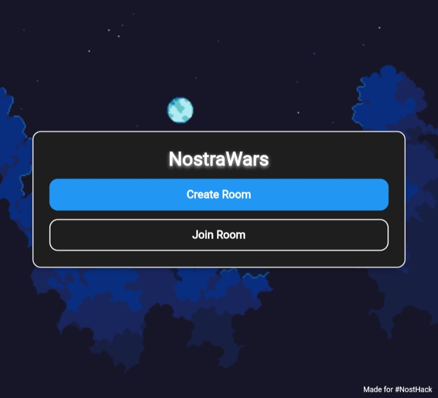 To try out the game, head over to "https://nostrawars.netlify.app/". You will see a loading screen with a silly UFO animation. After the loading screen, you will see two buttons: "Create Room" and "Join Room" (the latter is yet to be developed).