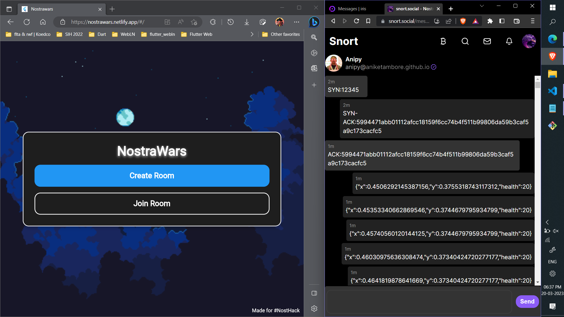First, the three-way handshake takes place. Once it is completed, we start playing the game, and the values of the player and the opponent pass through Nostr as {x:xxx,y:xxxx,health:xxxx}. The x and y values represent the position, and the health value represents the player's current health.