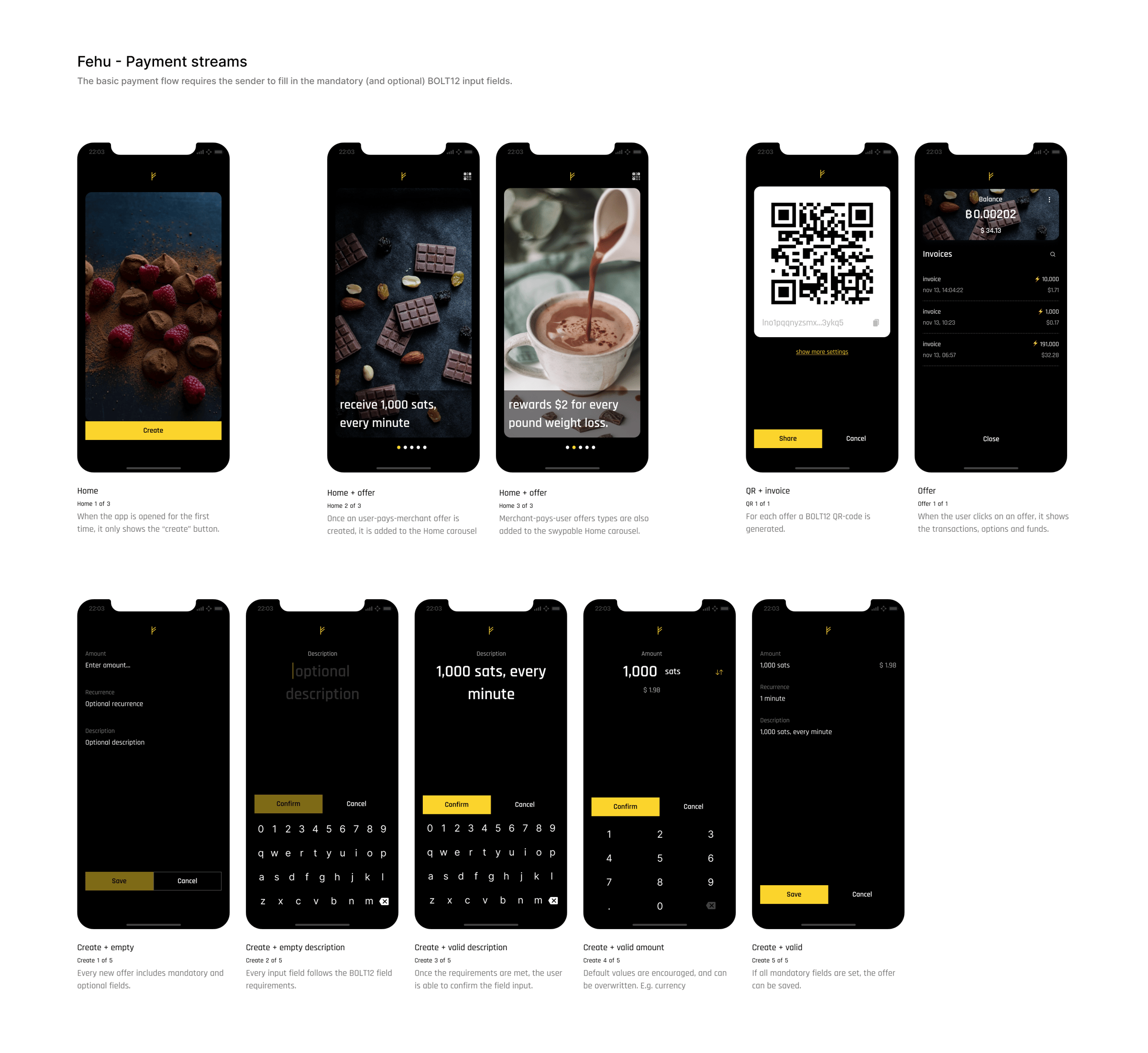 Reusing parts of the Bitcoin Design Community Figma wallet template, I created the bare minimum concept design and flow for the app. Some details such as all mandatory and optional BOLT12 fields are not included but will be added in the implementation. The "theme" and "layout" was partially reused from my bitcoin wallet. This not only helps speed up the design and coding, but it also reuses best practices such as the ones written in the Bitcoin Design Guide.