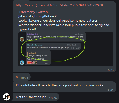 Looks like at least 21k sats up for grabs if you can discover the new feature to the @JukeboxLNDbot (@npub1wqtq2k9cawq2hkwz474xdm6ef0drmdhn4fk59hpyuex5l0ewa9rsj9a4cz)