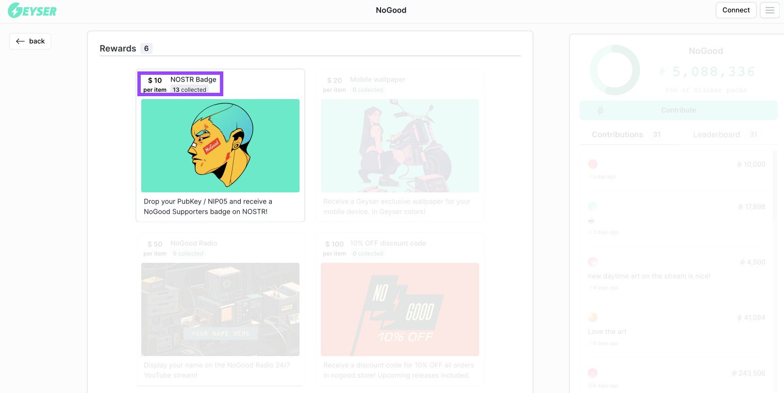 Example 1: No Good artist received most of his contributions by people who purchased his Nostr badge.