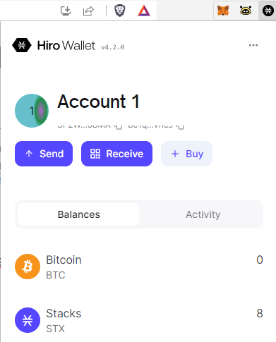 Then you install Hiro Wallet and set up an account to send the $STX there. It takes a while to be credited, remember that behind it is the Bitcoin network so each transaction can take from minutes to a couple of hours in the worst case scenario.