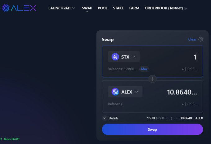 Ok, you now have the $STX in your wallet. Let's go to the #dex of this L2, which is https://app.alexlab.co/swap It's similar to Uniswap, but with Launchpad and soon orderbook.