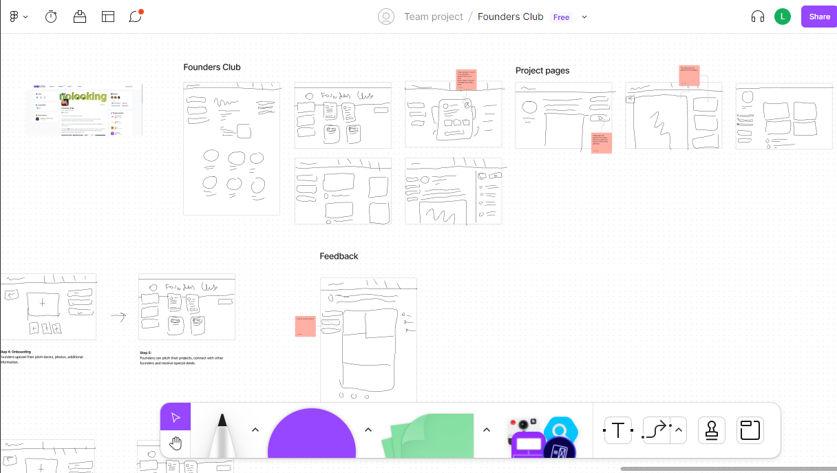 Completing the initial design phases such as planning, sketching, and research, and moving on to the next stage by creating wireframes and prototypes for Founders Club. -