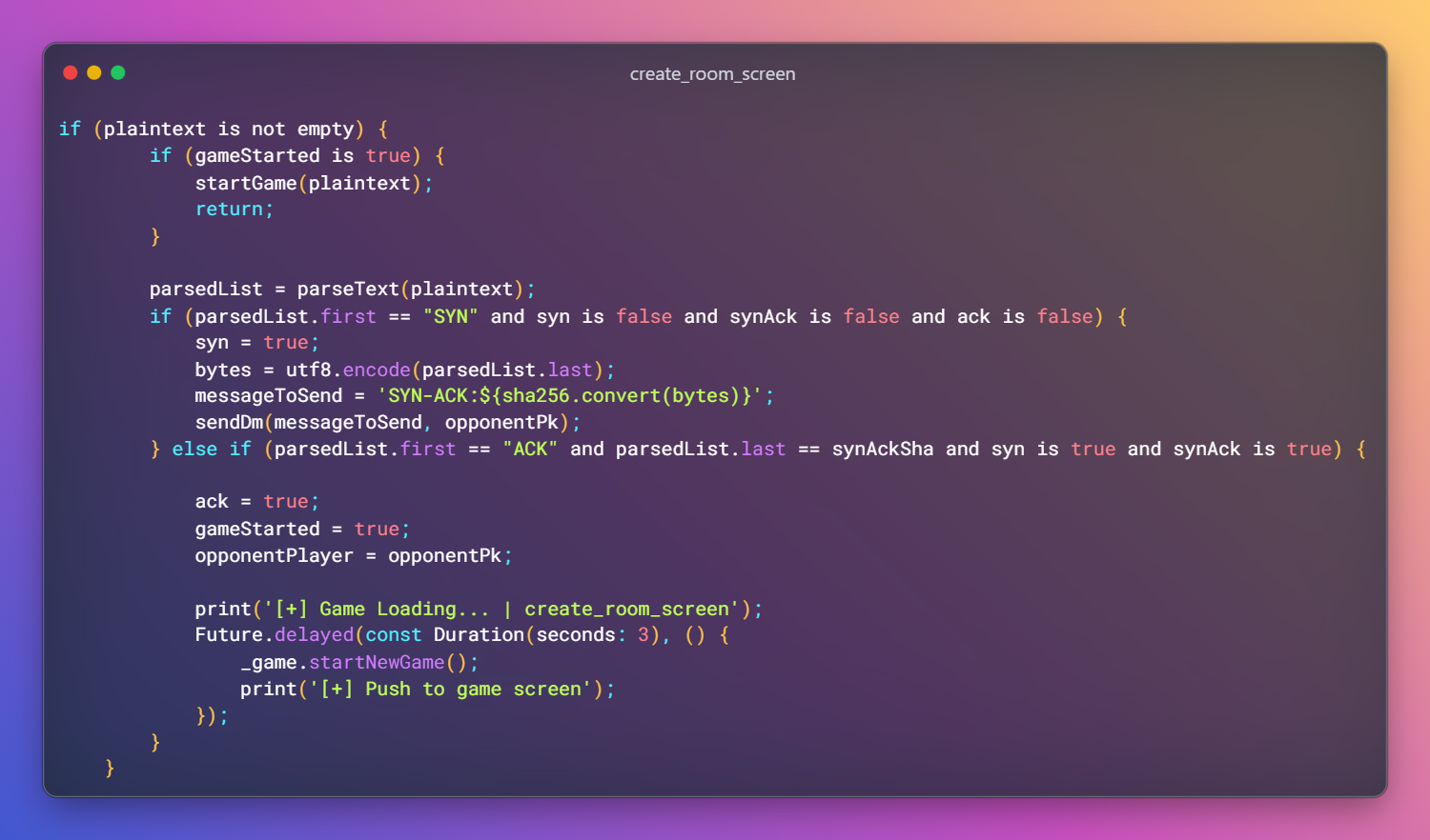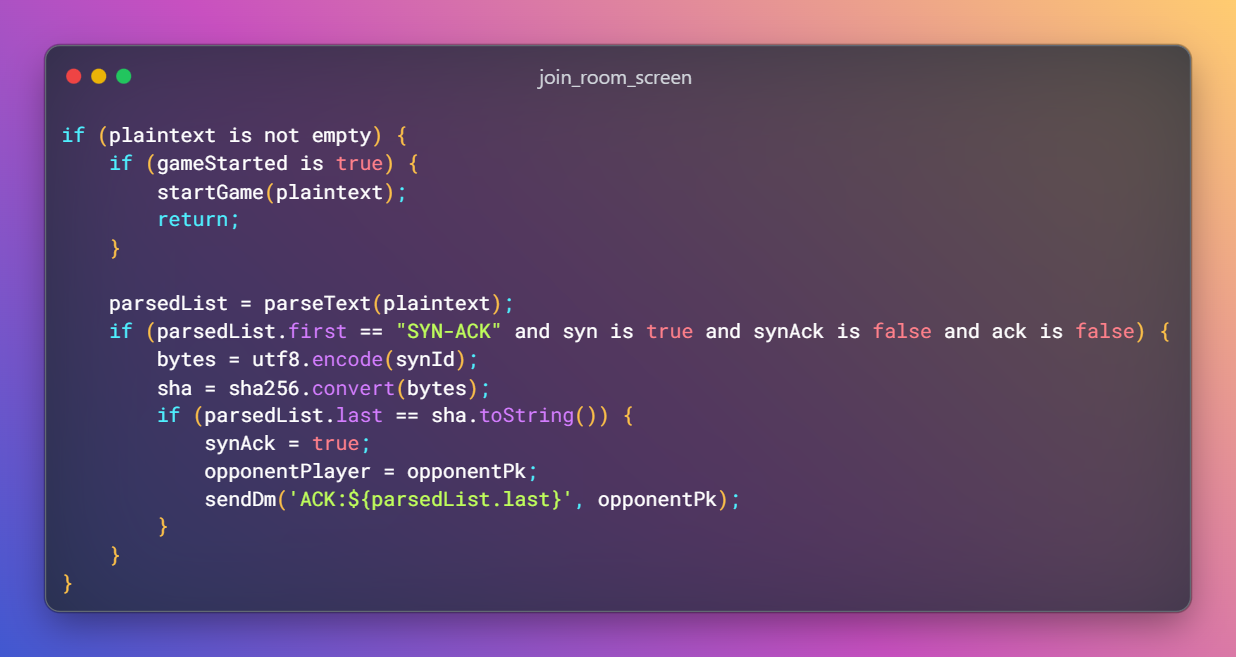 Now, let's talk about the 3-way handshake algorithm. When a player creates a room, the player waits for the opponent to join and send a "SYN:${uuid.v4()}" message. Any other message received is ignored. The player client then parses the message, splitting the terms by the ':' character. 'SYN' is the message type and '${uuid.v4()}' is a random sequence of bytes.