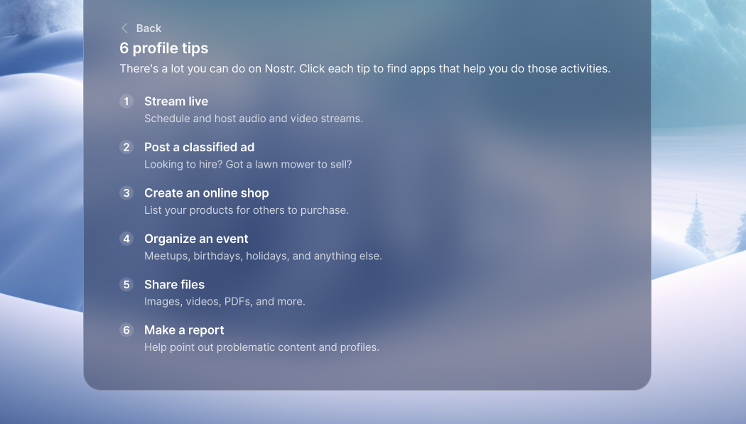 The tips are of course based on what events the site found for your profile (or more accurately, what it didn't find). You can click each tip to get redirected to nostrapp.link to a list of apps that support this specific activity.