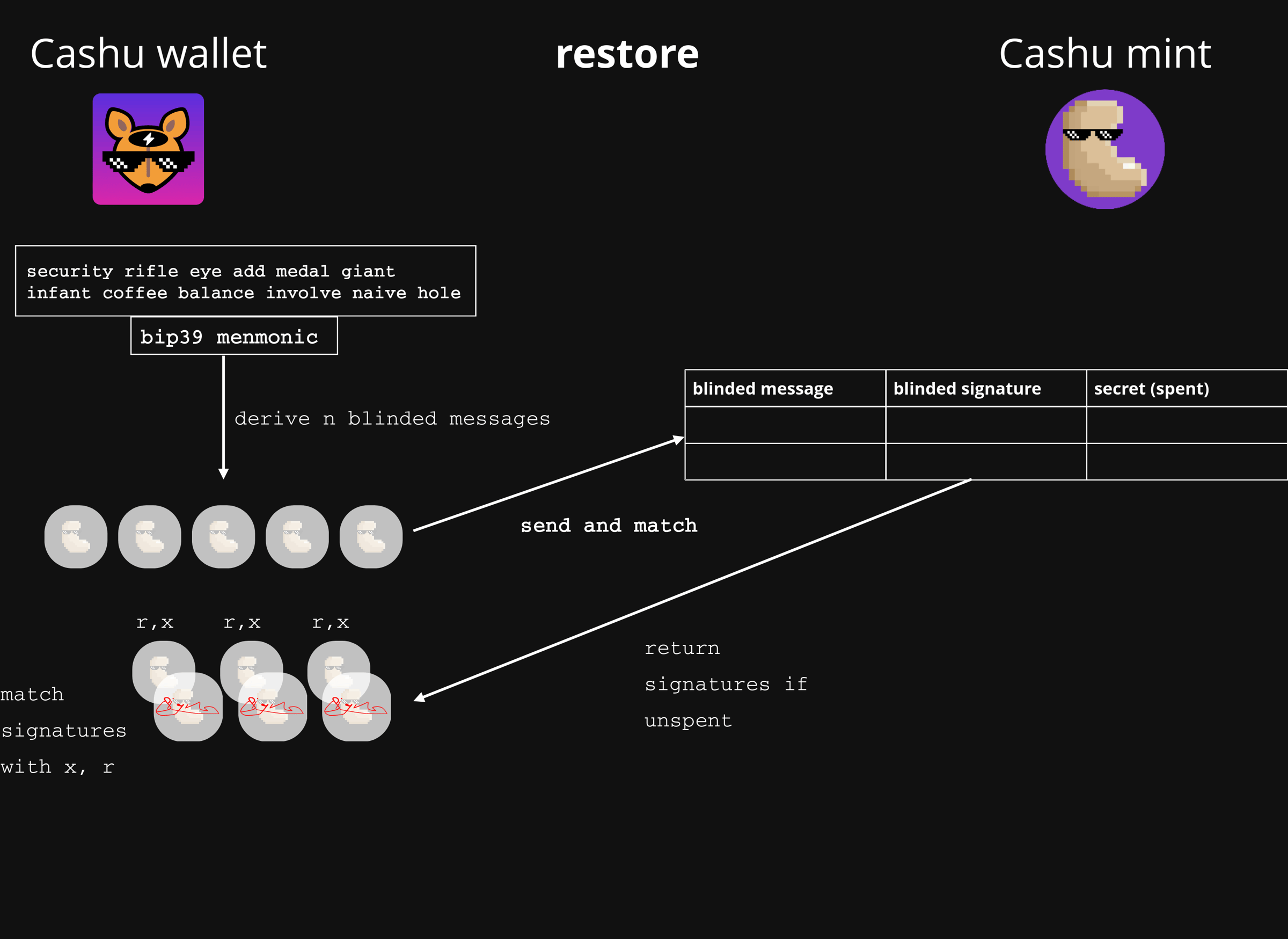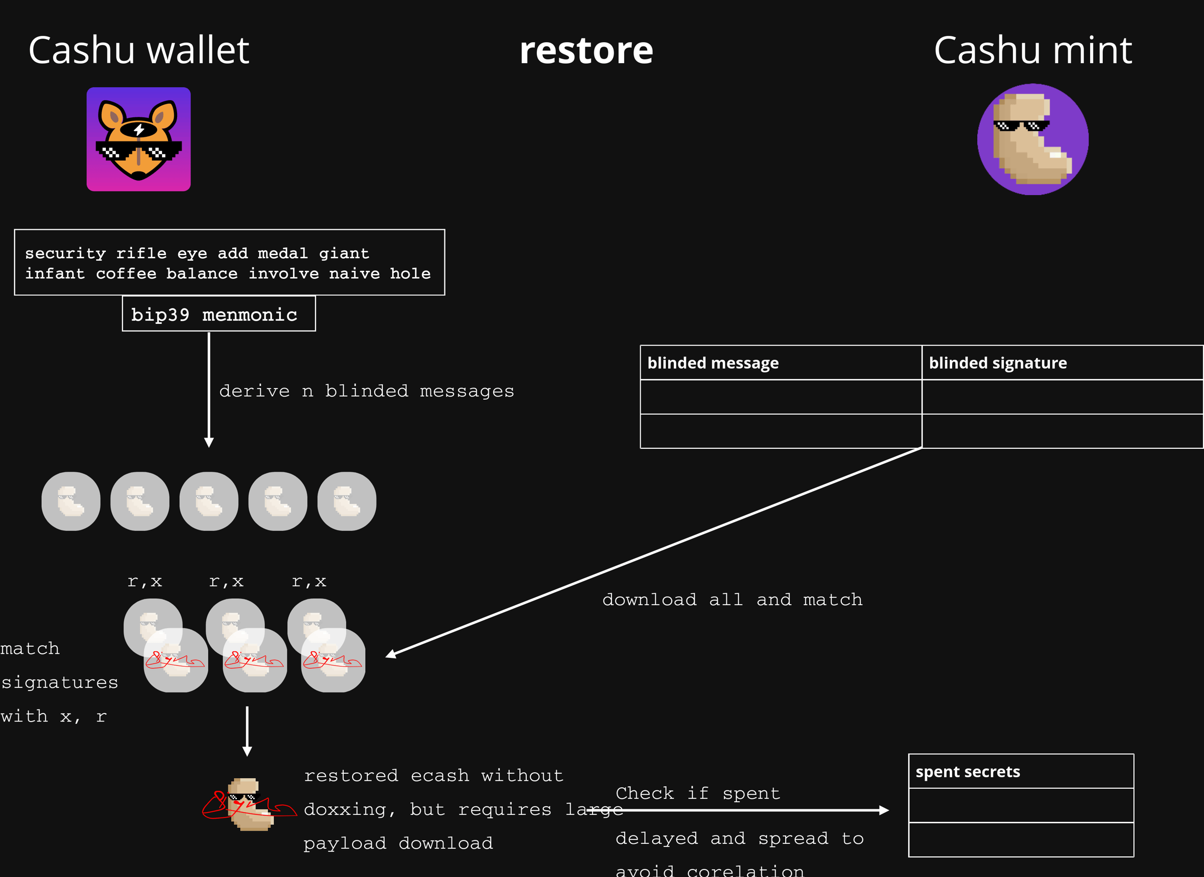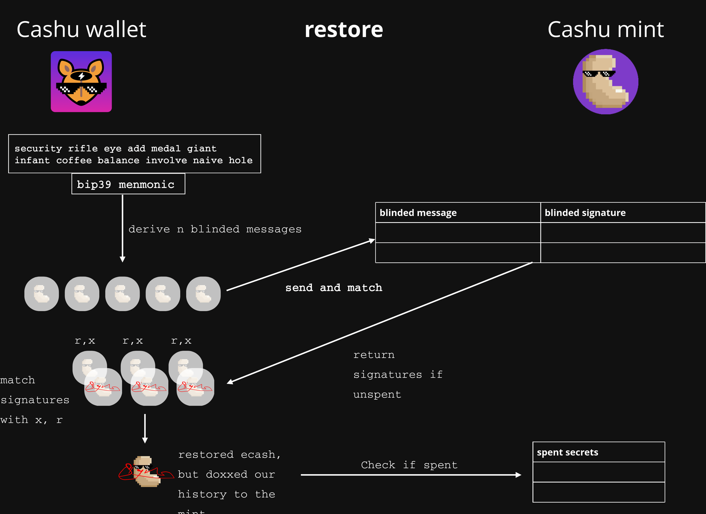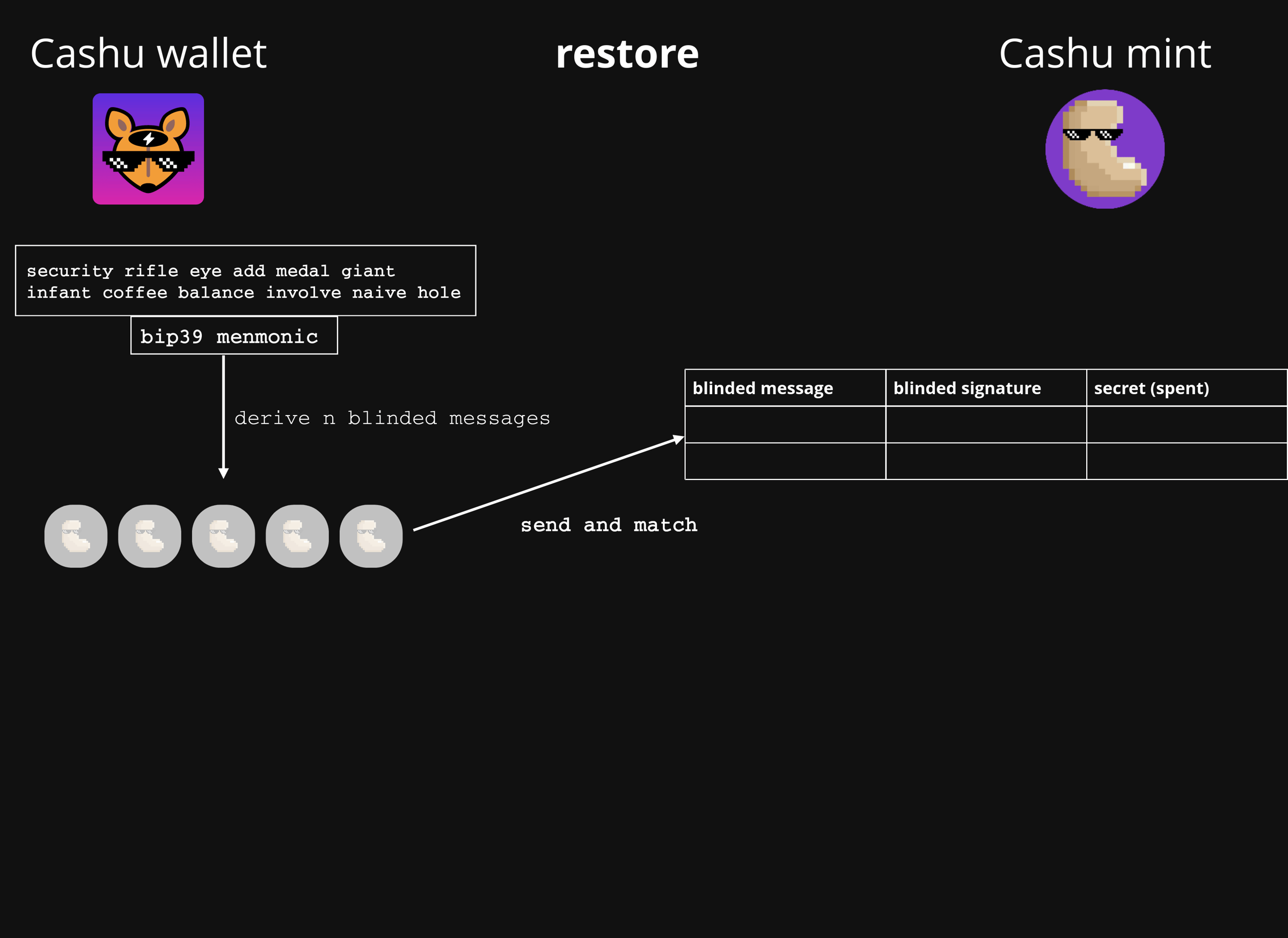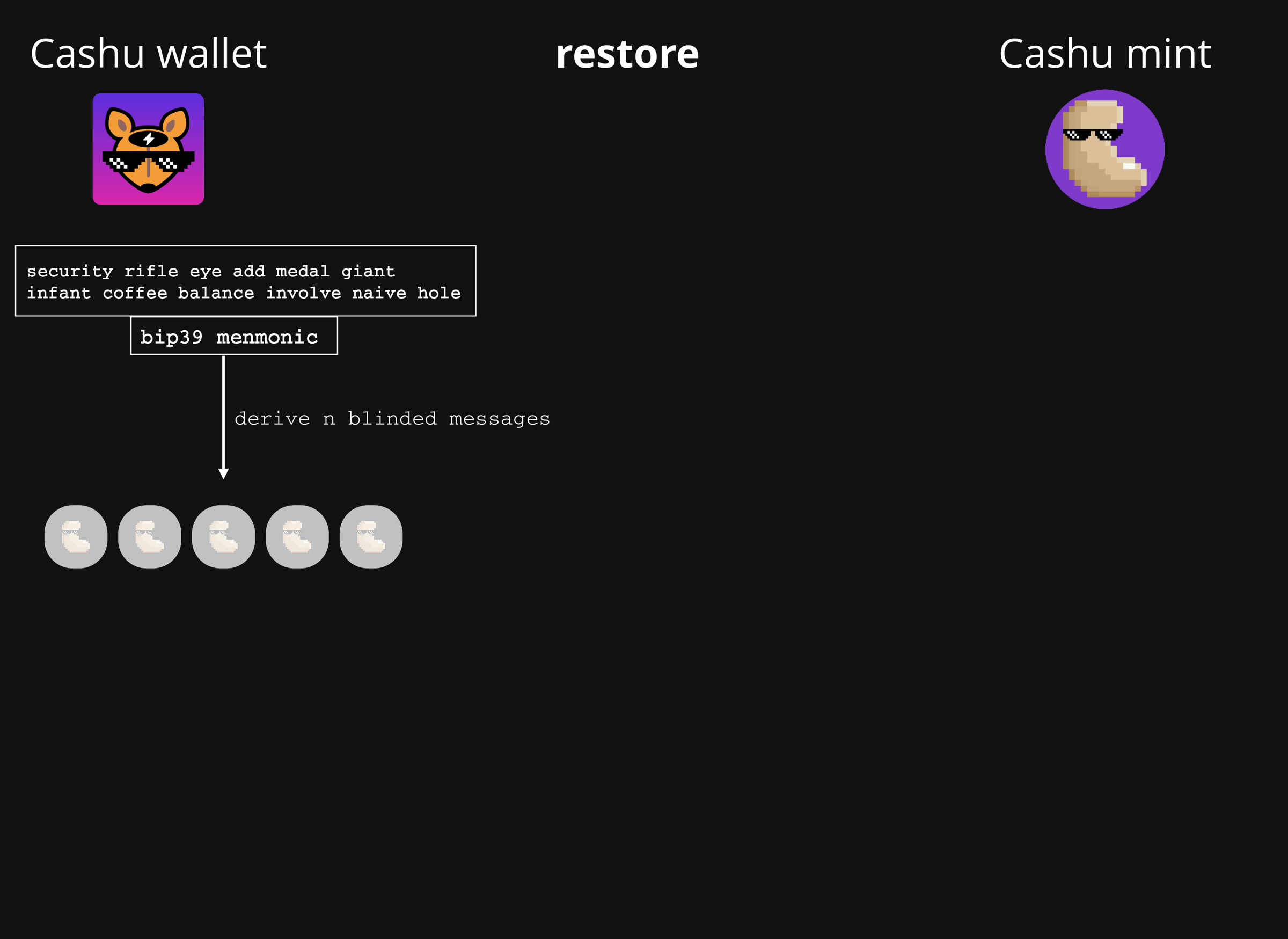 In case we lose our wallet, we can now restore the ecash via the seed phrase. We start out by generating a bunch of blinded messages derived from the seed phrase: