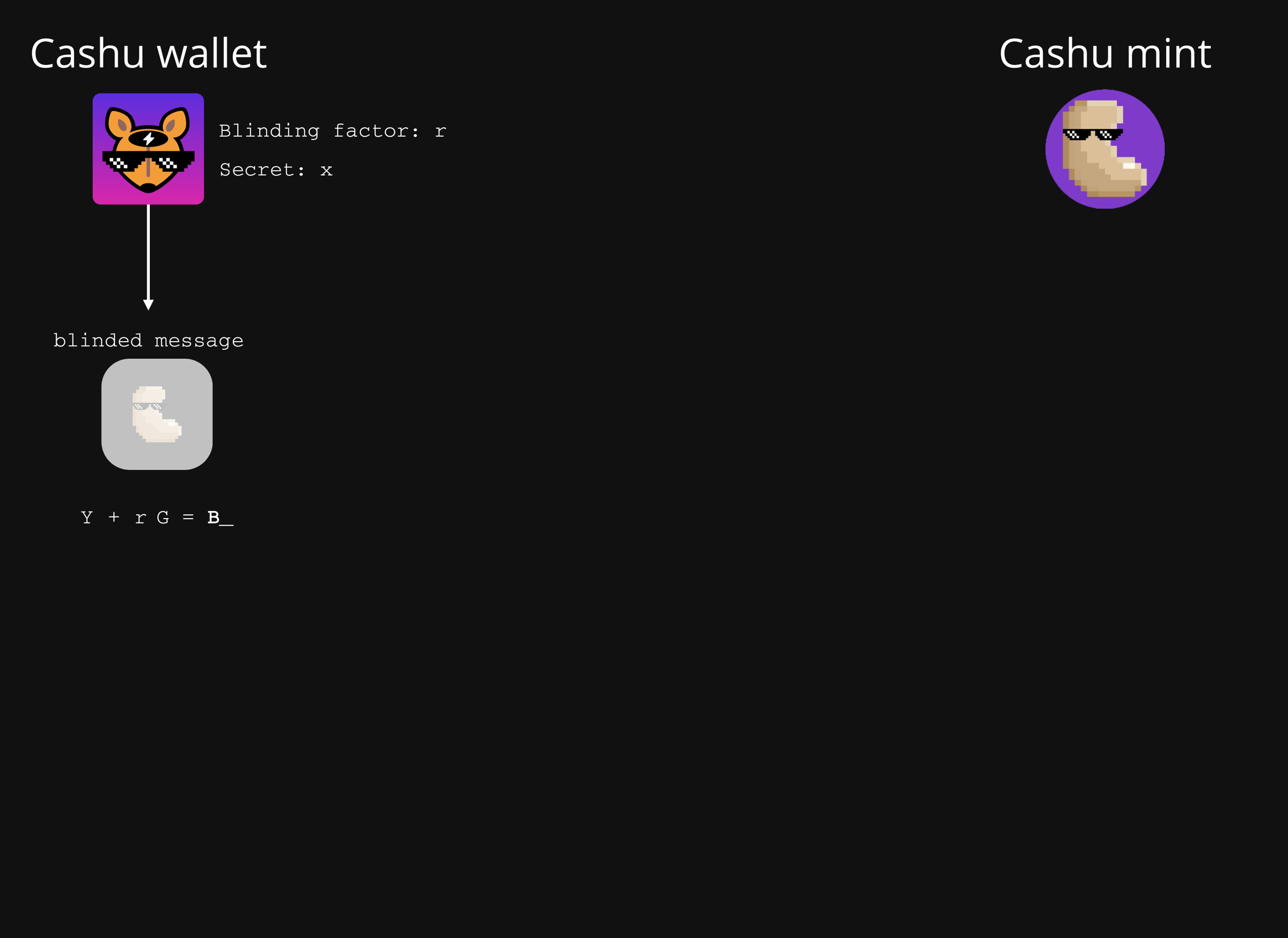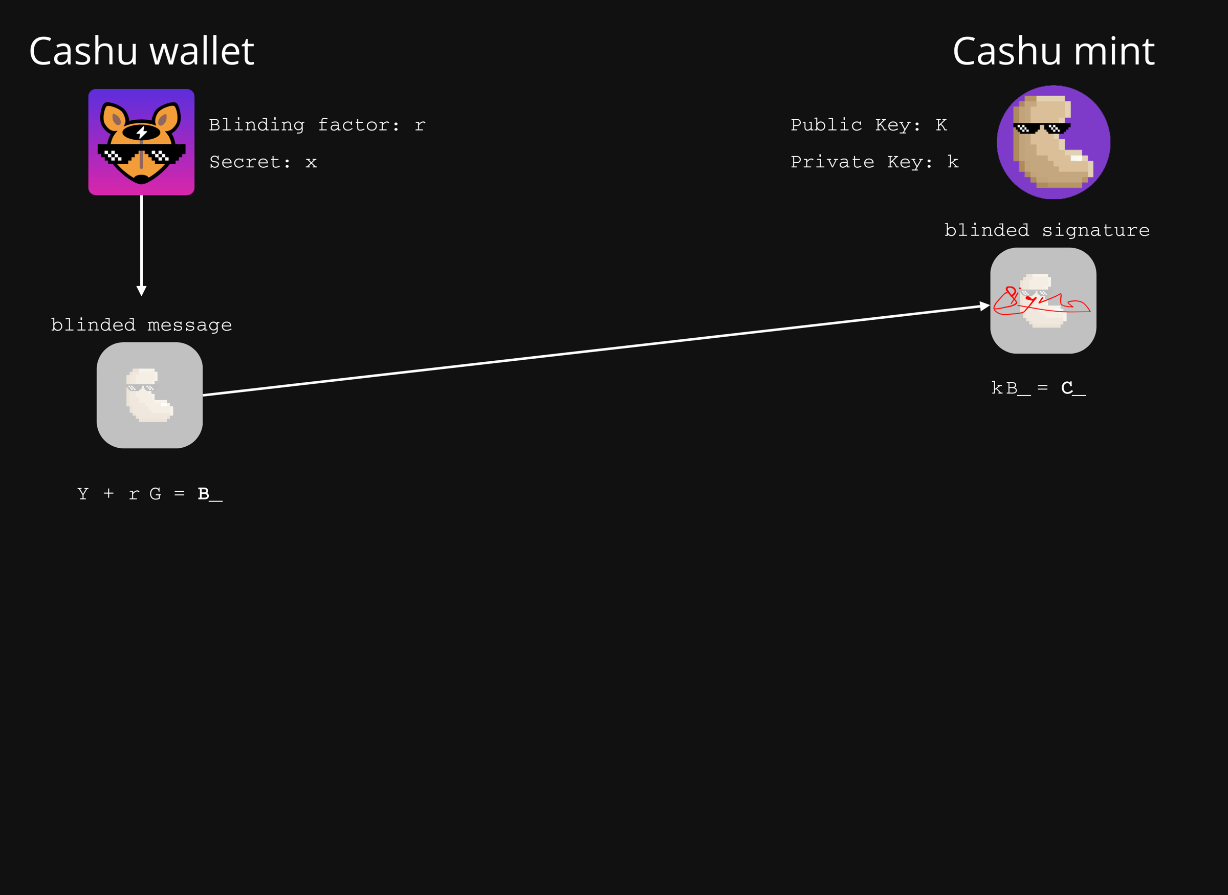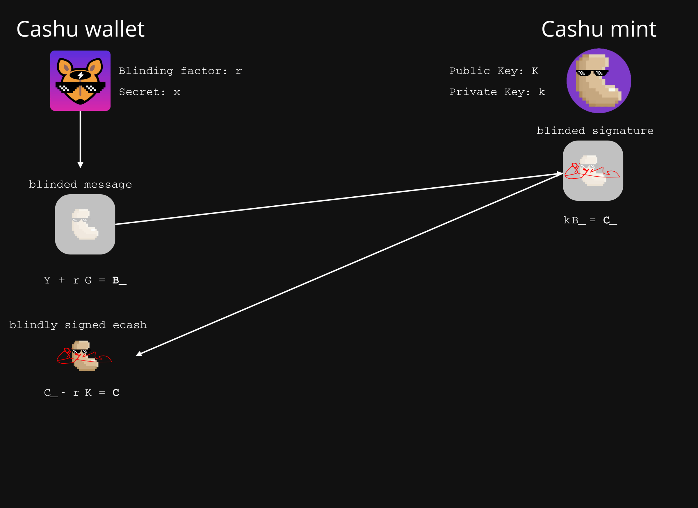 After the mint has signed, we can now "unblind" the blind signature C_ with the initial blinding factor r and the mints 1 sat public key K . This will give us C, the signature.