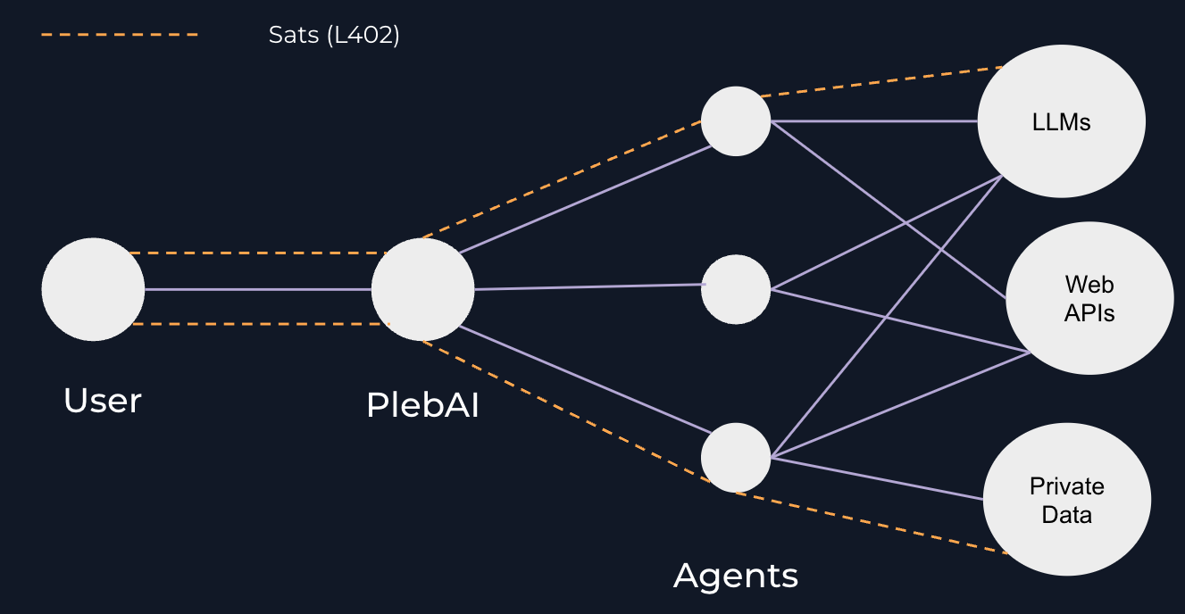 Our goal: any user inputs their desired request and the sats they're willing to spend. We aim to connect agents, data, and LLMs swiftly to deliver the perfect answer, pronto!