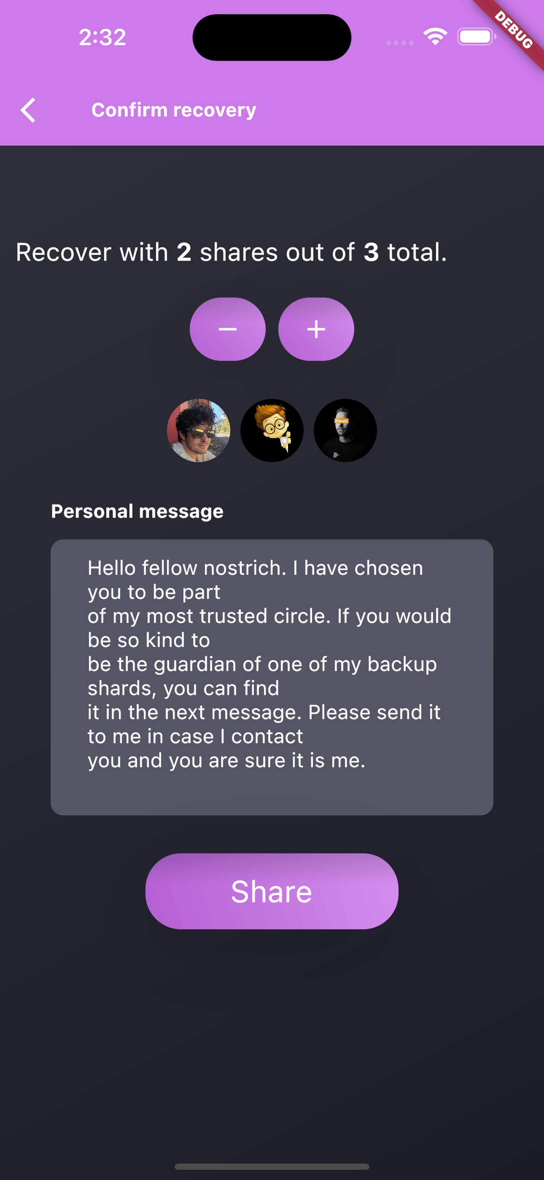 The app sends an encrypted DM to your 7 nostr contacts, each receive a shard of your private key.