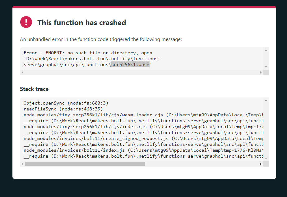 It has a dependency on tiny-scep251k, and that package seems to use webassembly somewhere, and this is not handled well by Netlify... -