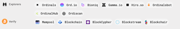 Don’t trust Preturnio? You shouldn’t - so naturally each search result can be verified with a single click to on one of several public block explorers as well as ordinal explorers for inscriptions. It's also easy to copy the TX ID to verify on your own node.