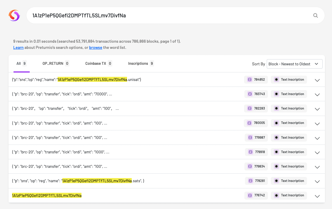 You can search for anything: source code, names, quotes, brc-20 tokens – any plain text you can think of, you can find in the blockchain with Preturnio.