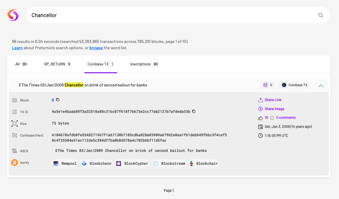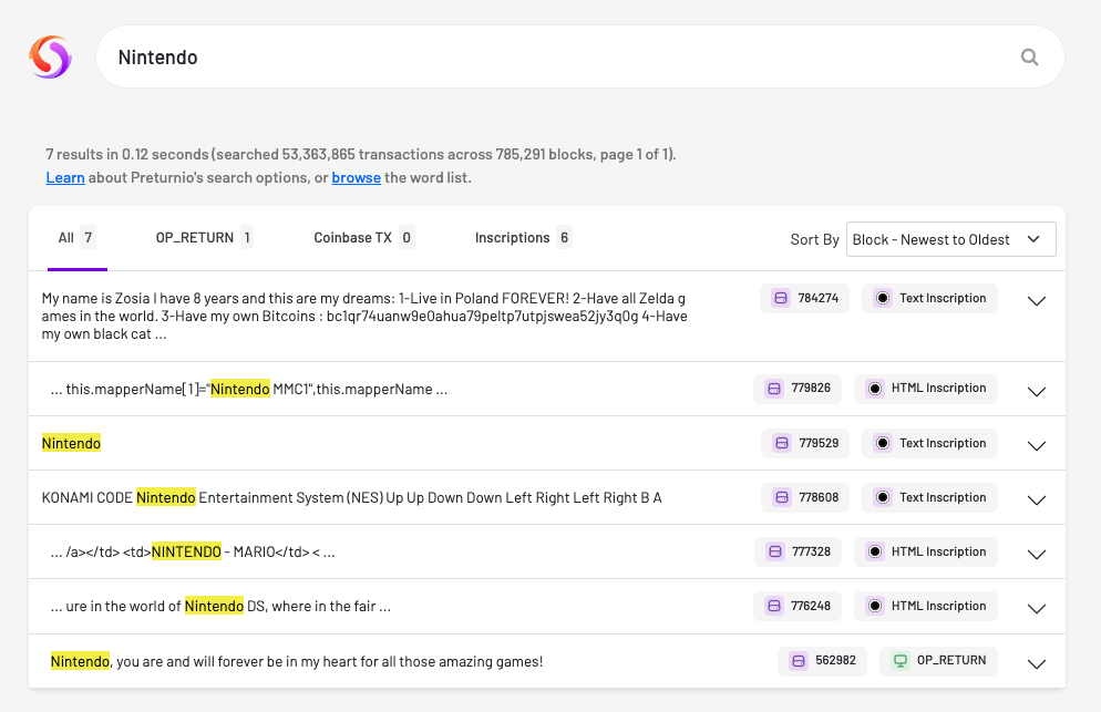 I'm excited to share the new project Preturnio (https://preturnio.com) - a full-text search engine for Bitcoin. With Preturnio you can search for text inside every OP_RETURN, Coinbase transaction and ordinal transaction since the genesis block (block 0).