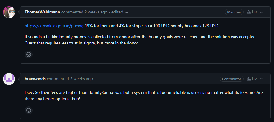 So some existing platforms, like Algora, don’t bother with escrow. But, as one former BountySource user pointed out, that just shifts the trust to the bounty grantor.