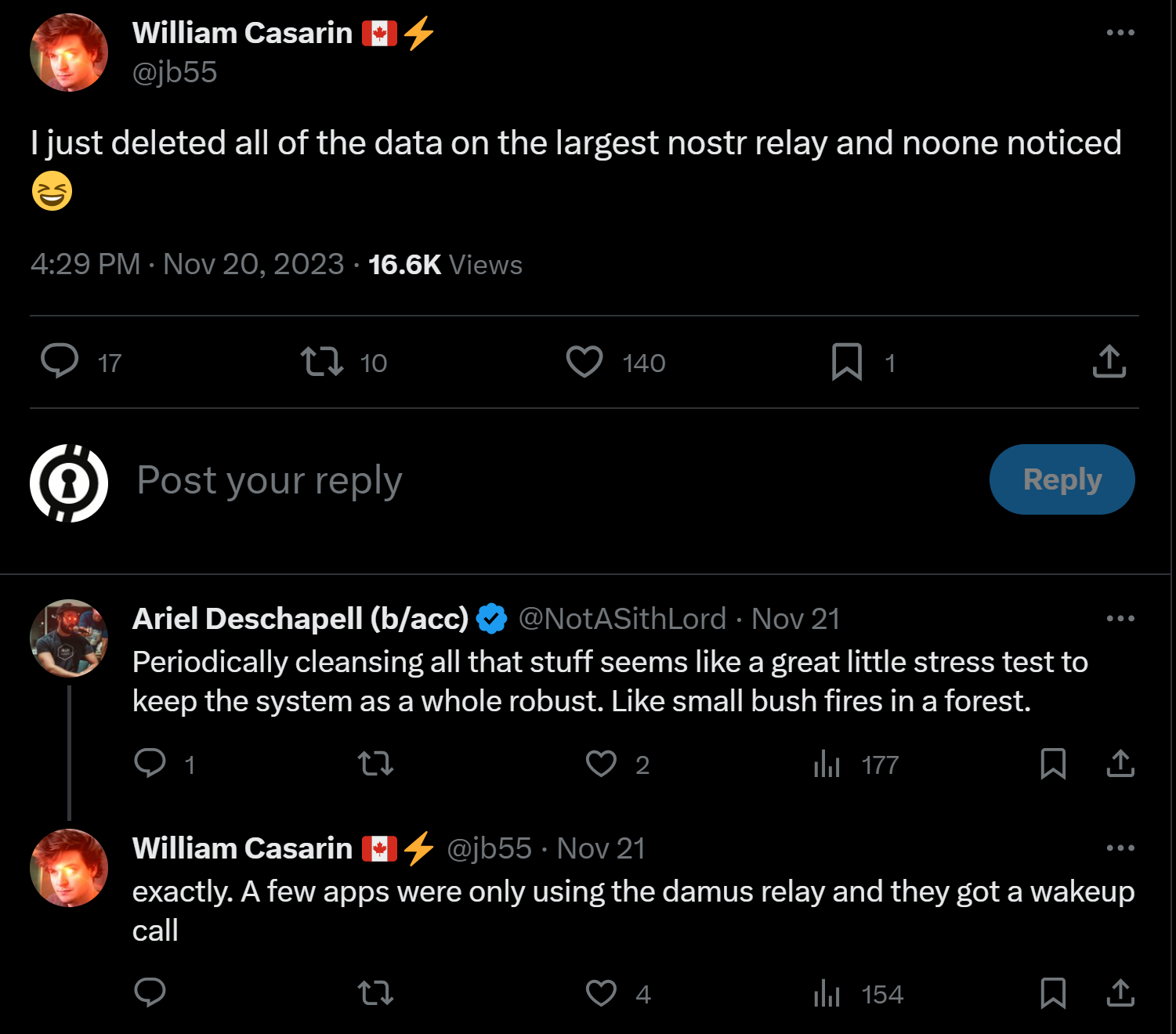 We also received a wake-up call courtesy of JB55, the developer behind the popular Nostr🦩client Damus and steward of the largest nostr relay. On Novemeber 20, he deleted all the data on the relay.