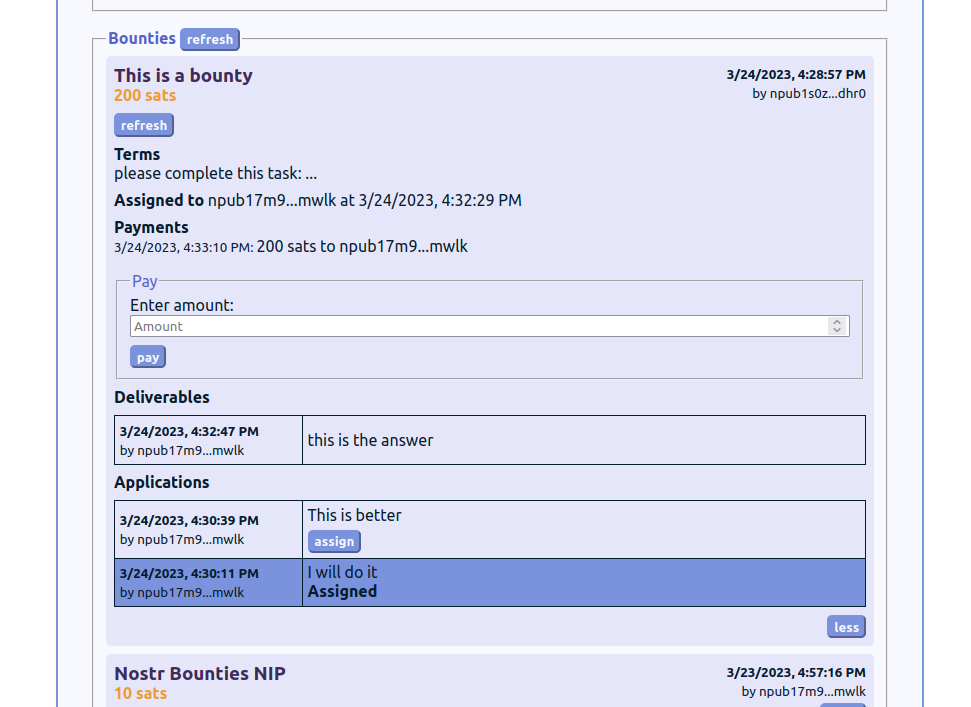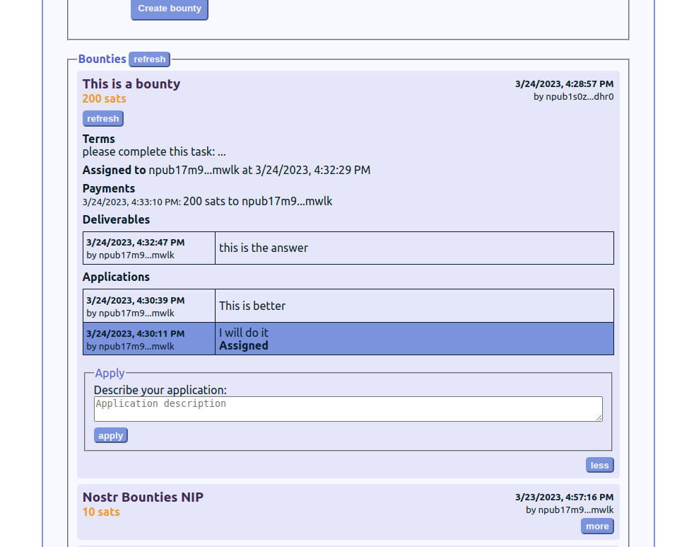 - Different users can apply for the same bounty, and the bounty creator can assign who will receive it.