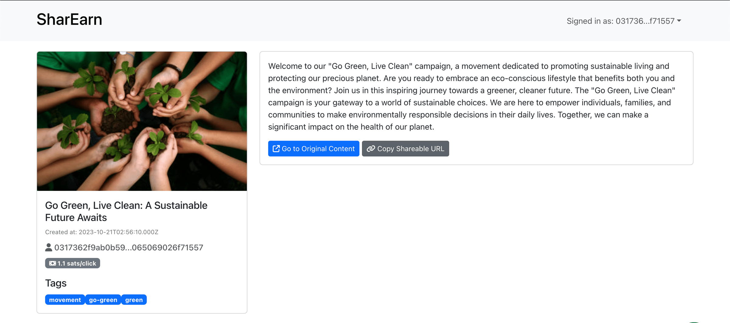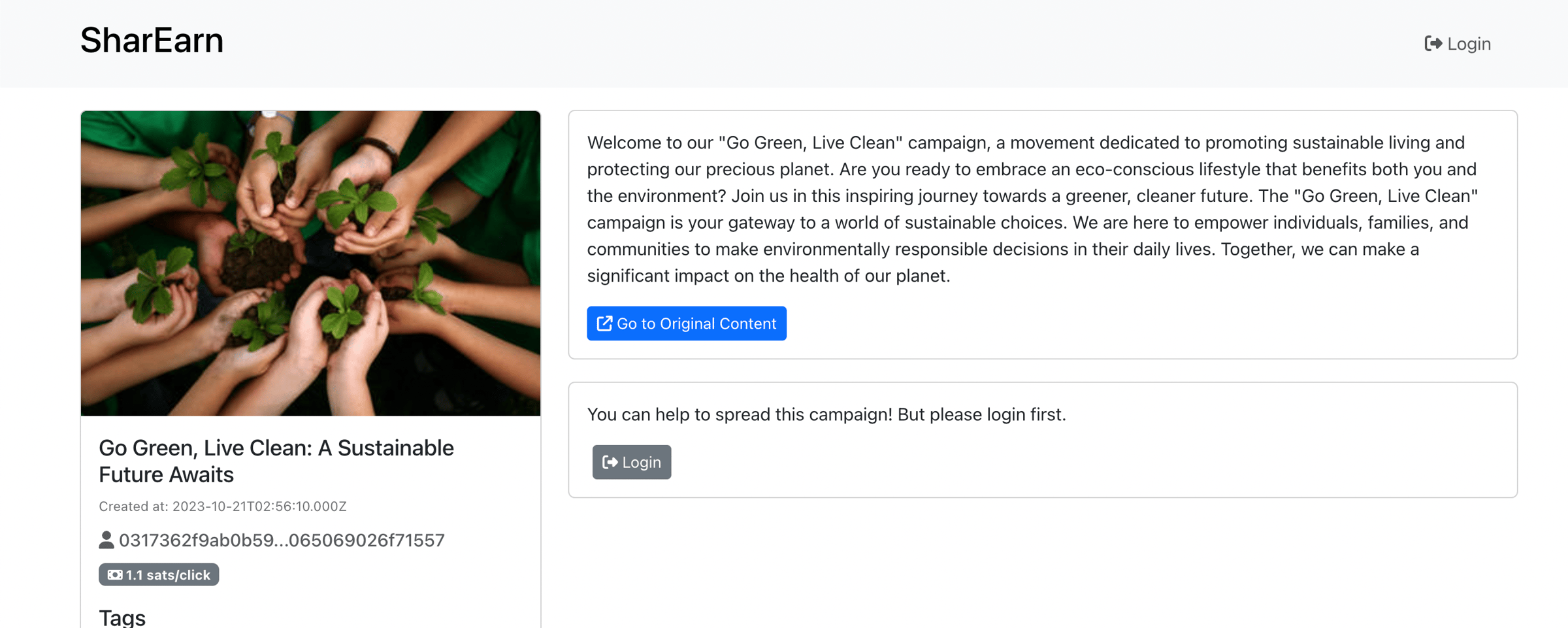 Users can read the details about the campaigns by clicking one of the campaign. More detail detail information will be shown on this page. If users want to help spread the information they can get the shareable URL, but they need to login first.