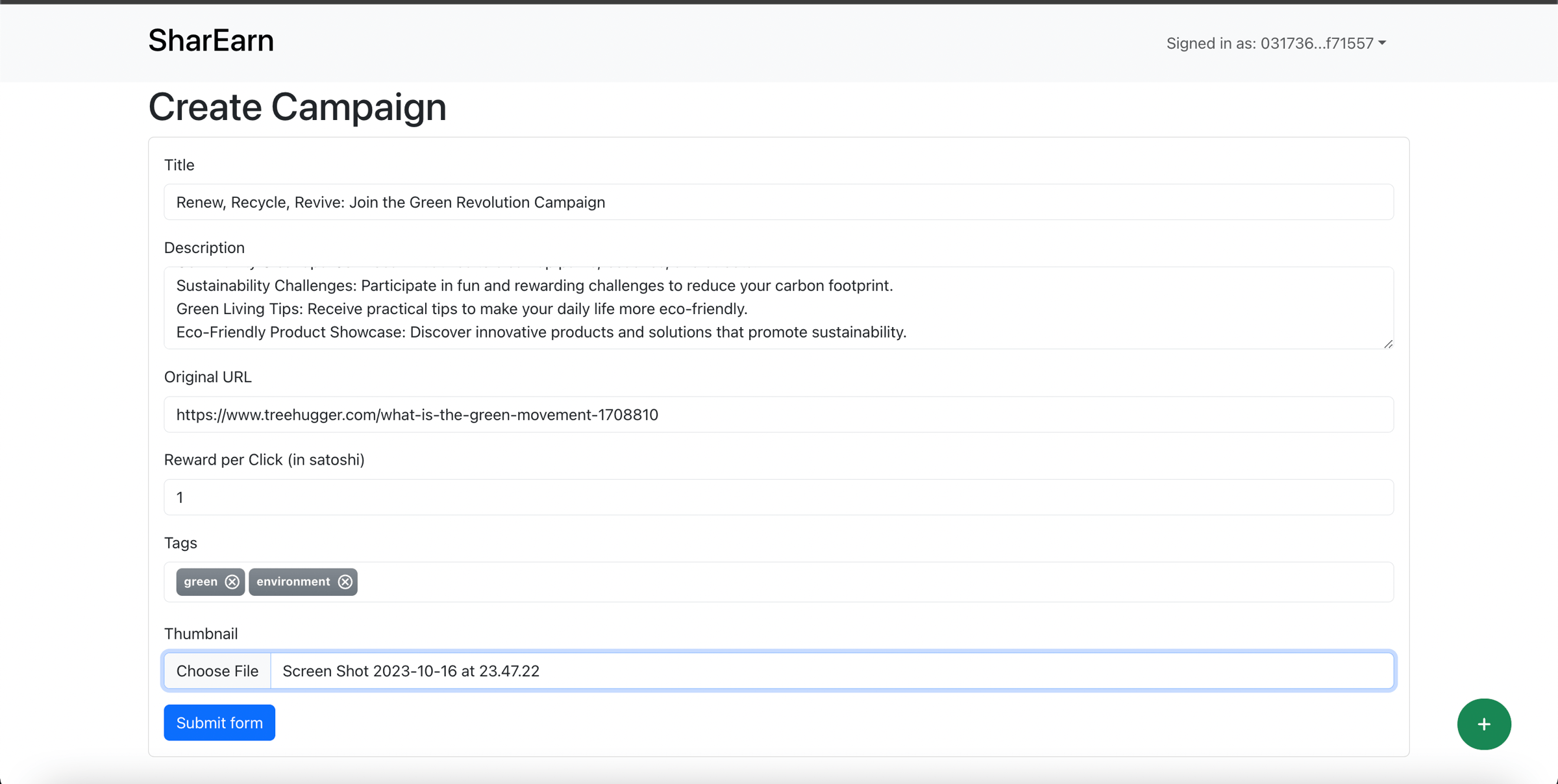 First, user need to login to the platform with LN-URL. Then you can click floating green button on the right-bottom side of the screen, then you will redirected to Create claim page.
