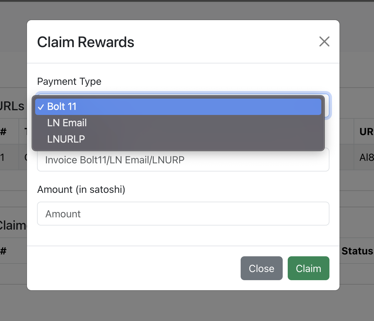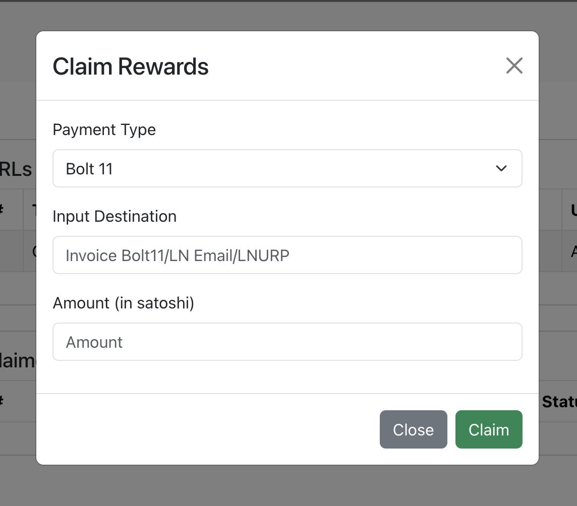 User can select the claimed method of the rewards, the provided option is Bolt11 Invoice, LN Email or LNURLP.