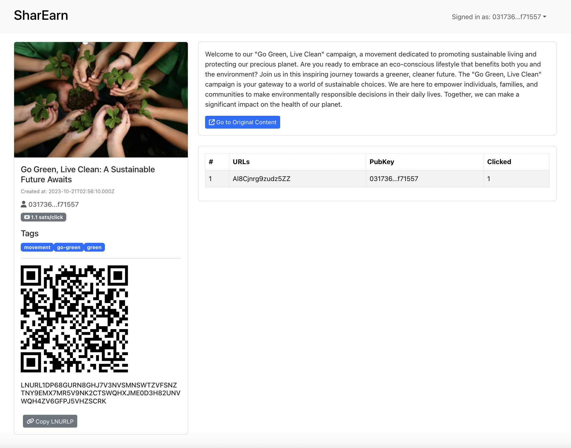 User can see the detail of your campaign by clicking the campaign. This page provide information about LNURLP and generated shareable link and each click counter.