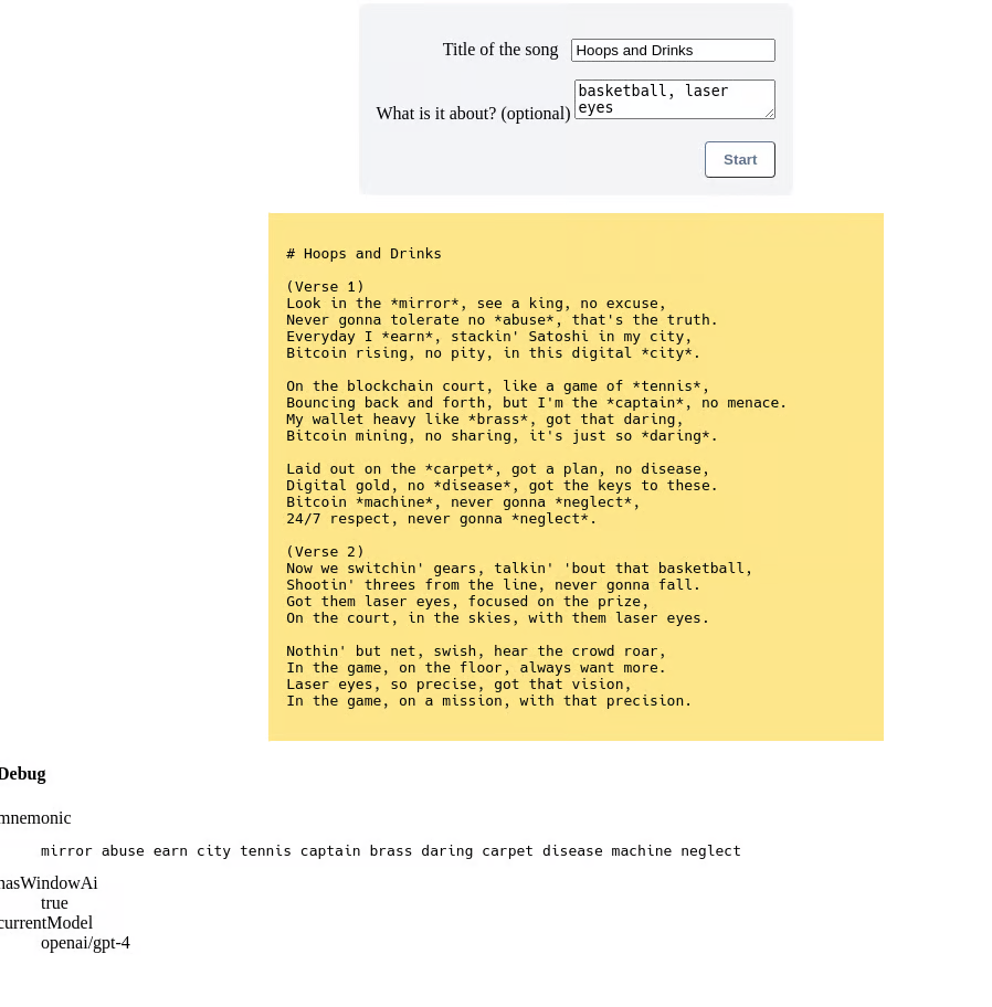 The idea behind the "39 Rhymes" rapper bot was to use words from the English BIP39 wordlist to compose rhymes, but feeding all 2048 in a prompt would be too much tokens (I tested it in the playground) for the public APIs of Chat GPT and others. So I had to pivot.