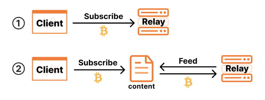 A client can subscribe to a relay (subscribing to all its contents) or specific content fed by some relays. Both will require new NIPs on Nostr. In case (1), the relay keeps a whitelist of clients, and independently implements a payment logic to whitelist clients. In case (2), the clients subscribe to some contents with unique identifiers (e.g., from some authors). The payment should be routed by some protocol to incentivize the corresponding relays and authors.