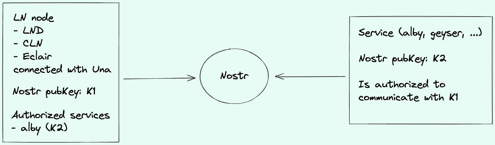 Una-connect uses encrypted direct message (NIP-04) to communicate securely between LN node and service. Thanks to a configuration file, only specified Nostr public keys (services public keys) can control your node.