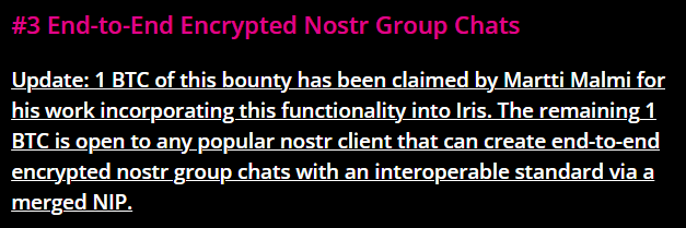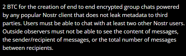 The example given was the Human Rights Foundation's bounty for "End-to-End Encrypted Nostr Group Chats," which gave only a short description of what product would satisfy the bounty: